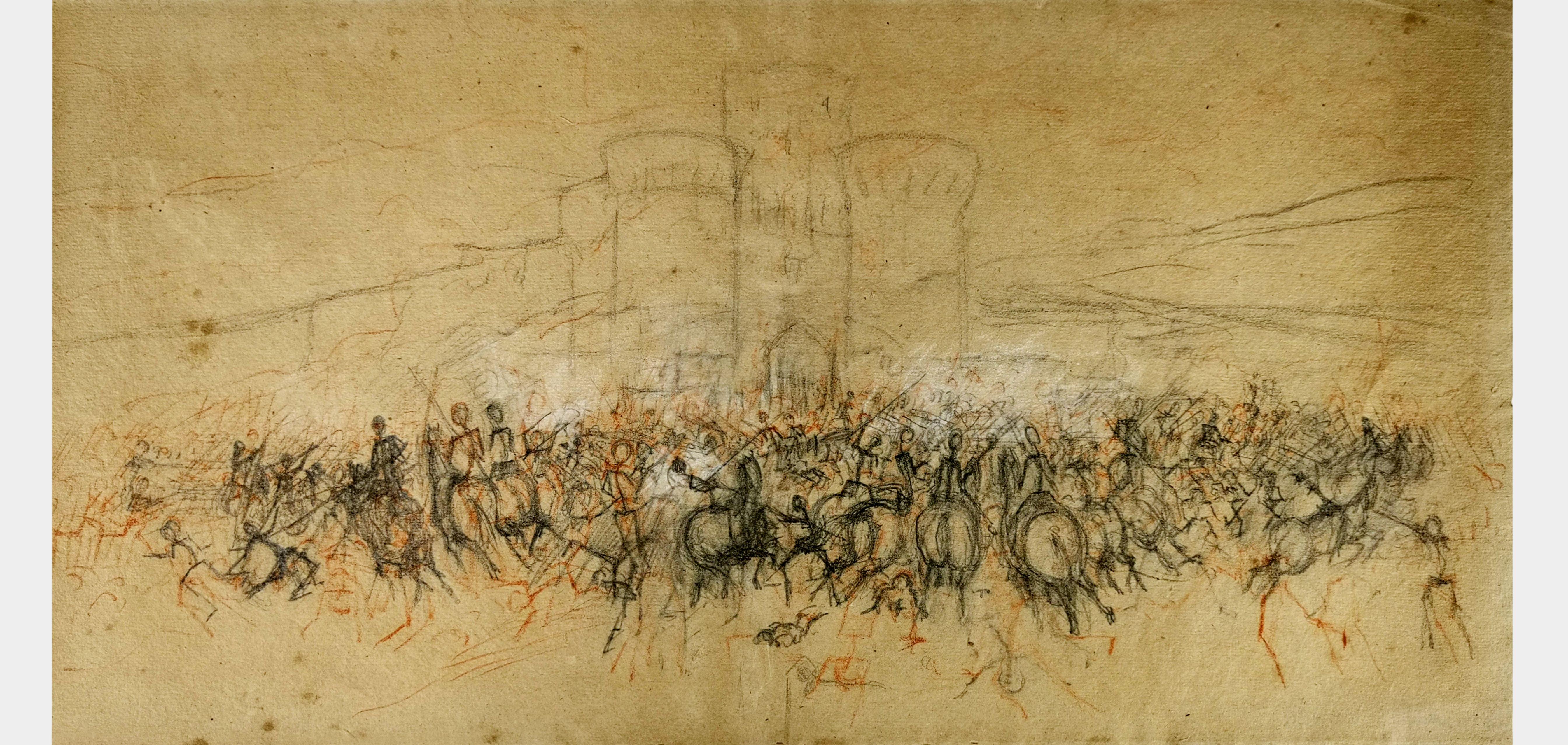 Etude pour un siège devant une fortification, mine de plomb, sanguine et craie blanche sur papier, 28x55 cm