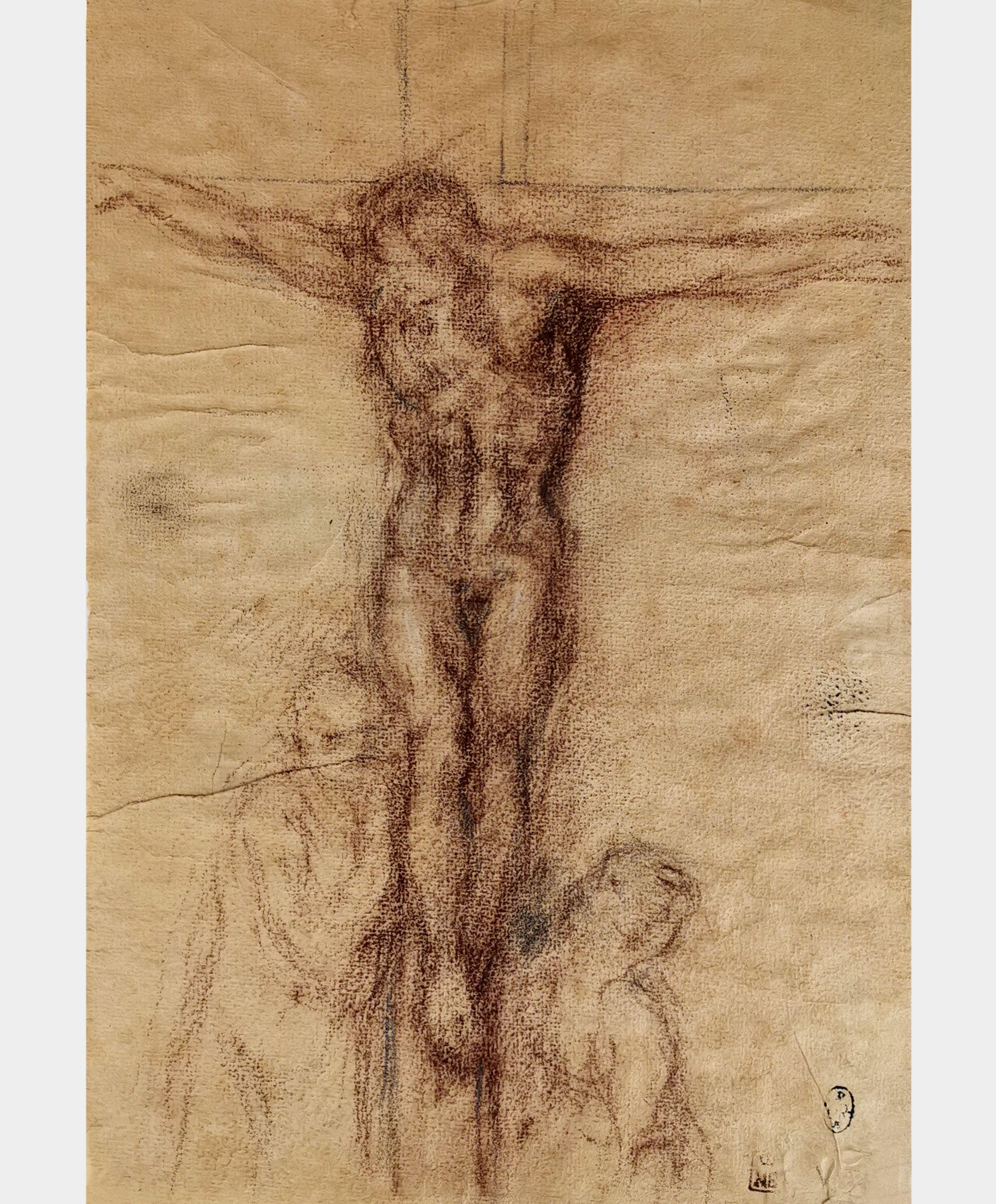 Christ en Croix et station du Chemin de Croix, deux sanguines sur papier, 24x23 et 29 x20. Cachets de collection apocryphes de la bibliothèque royale de Windsor (Edward VII, roi d'Angleterre de 1901 à 1910). Lugt L.901 et uniquement sur l'un de la collection Prince N. Esterhazy (1765-1833). Lugt L. 1965