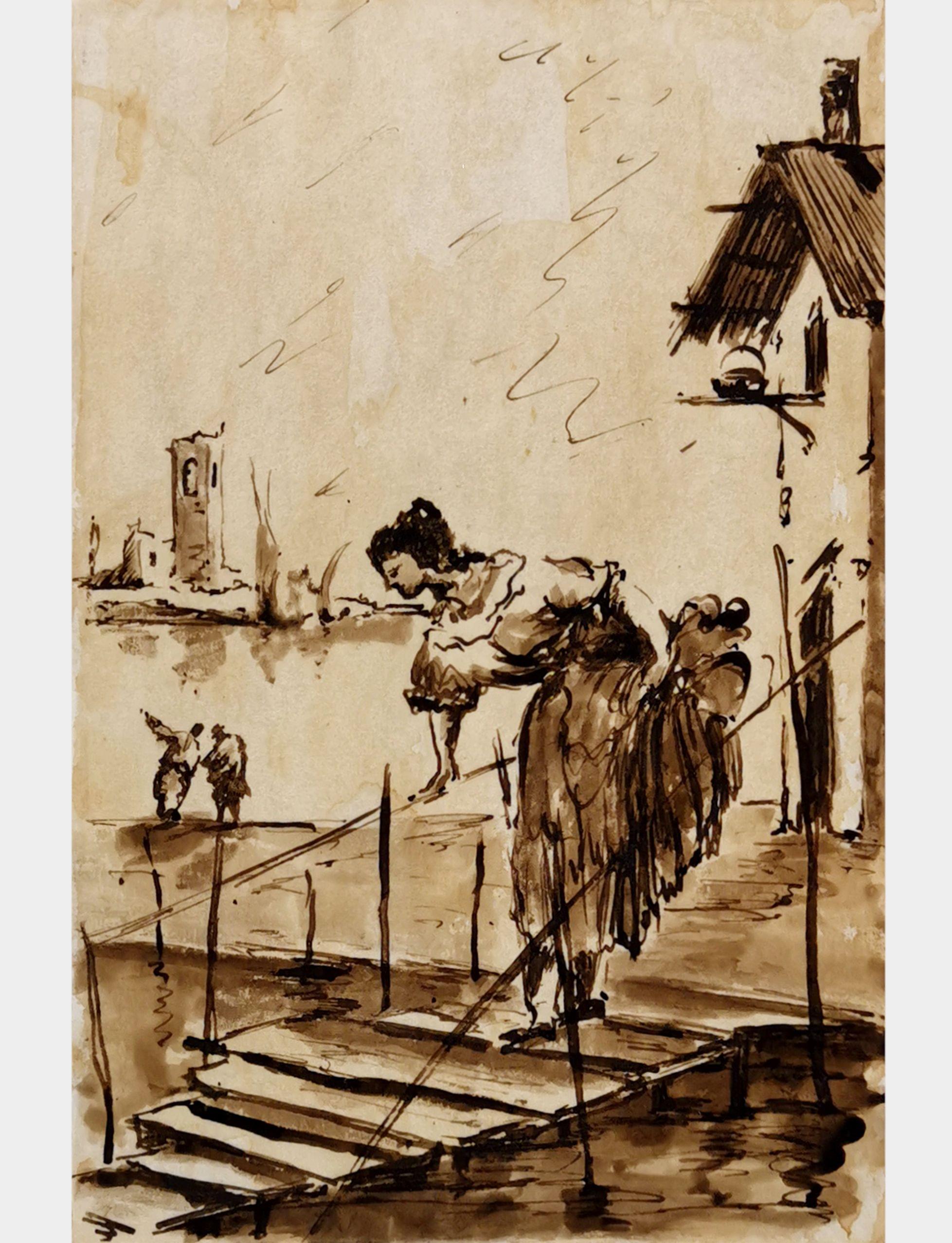 Jeune fille traversant un pont, encre sur papier, 19x14 cm