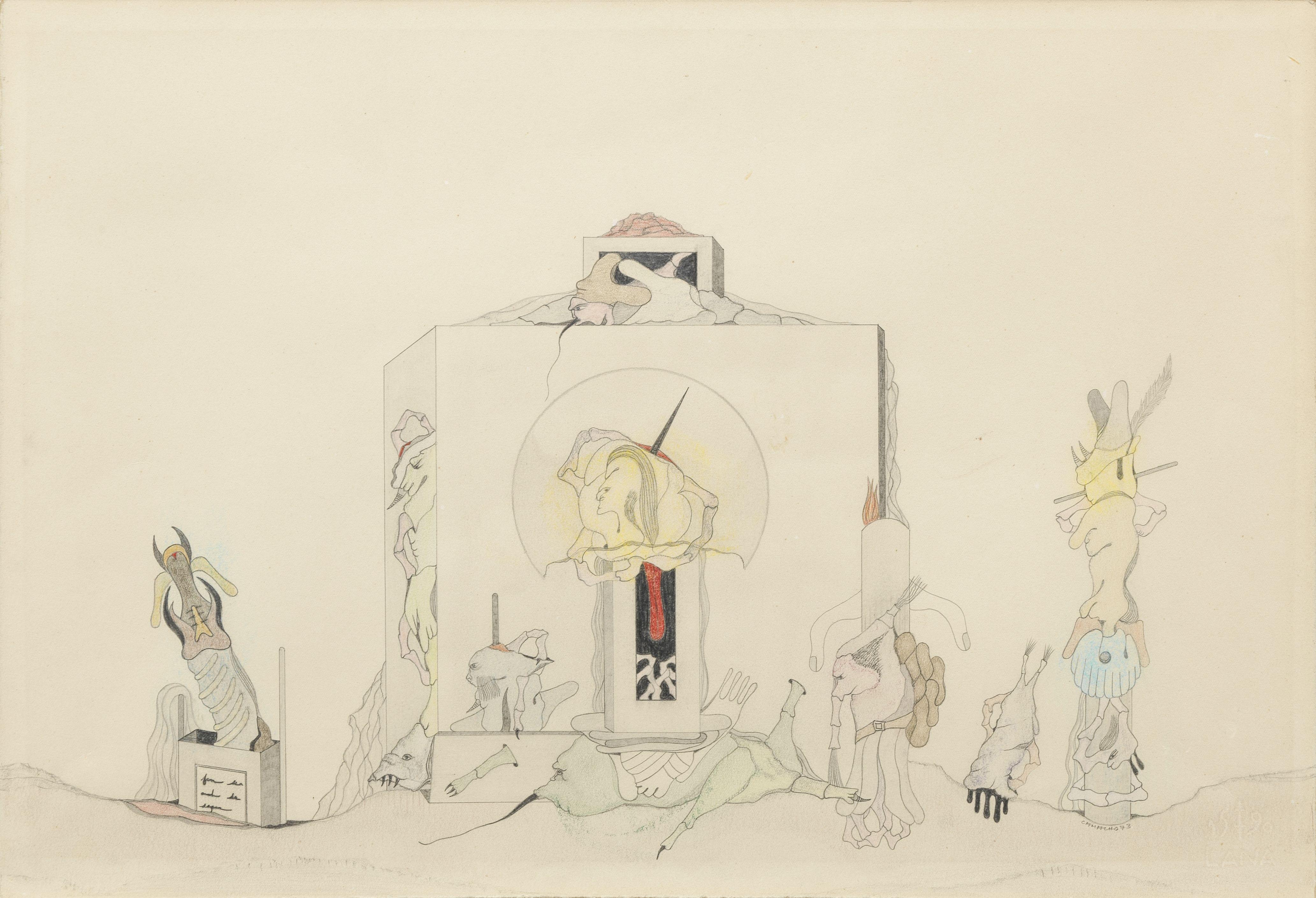 Sans titre, mine de plomb et crayon de couleur sur papier, signé et daté 73, 39x56 cm