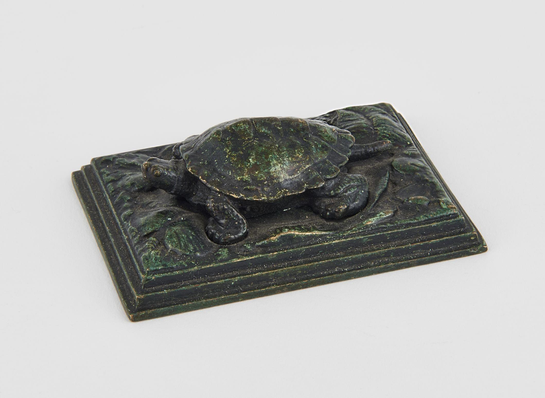 Tortue sur plinthe carrée, bronze à patine verte, 7x5 cm.