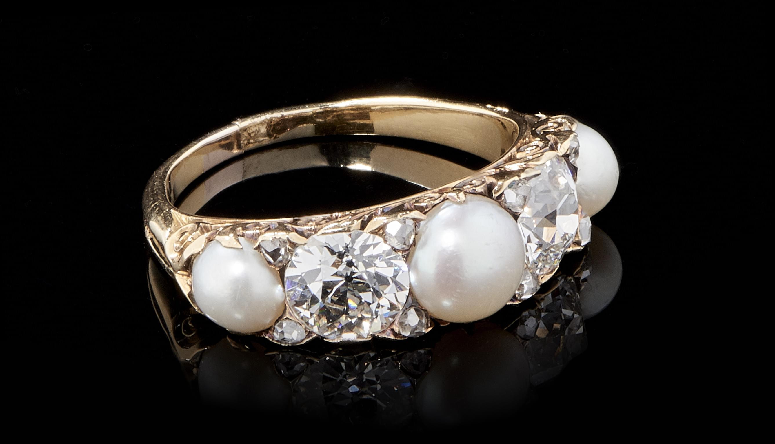 596. Bague jarretière sertie de deux diamants taille ancienne (total env. 1,5 ct) alternés de trois perles probablement fines et réhaussés de roses de diamant