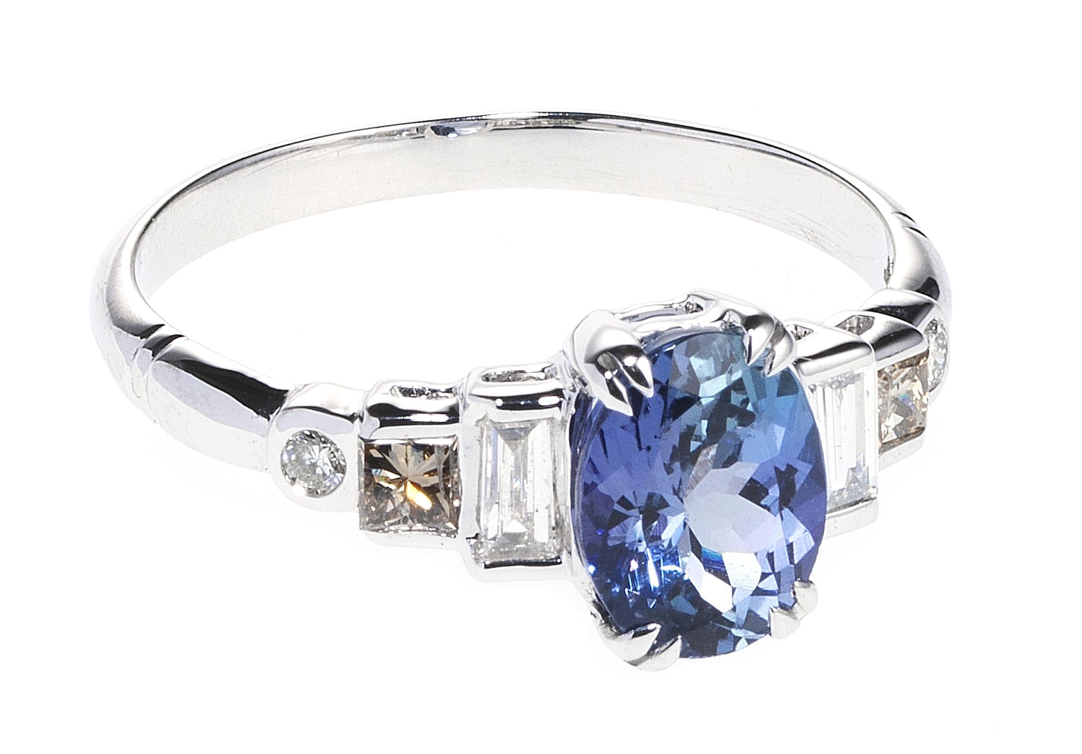 3197. *Bague sertie d'une tanzanite taille ovale (env. 1,1 ct) épaulée de diamants et d'un diamant champagne