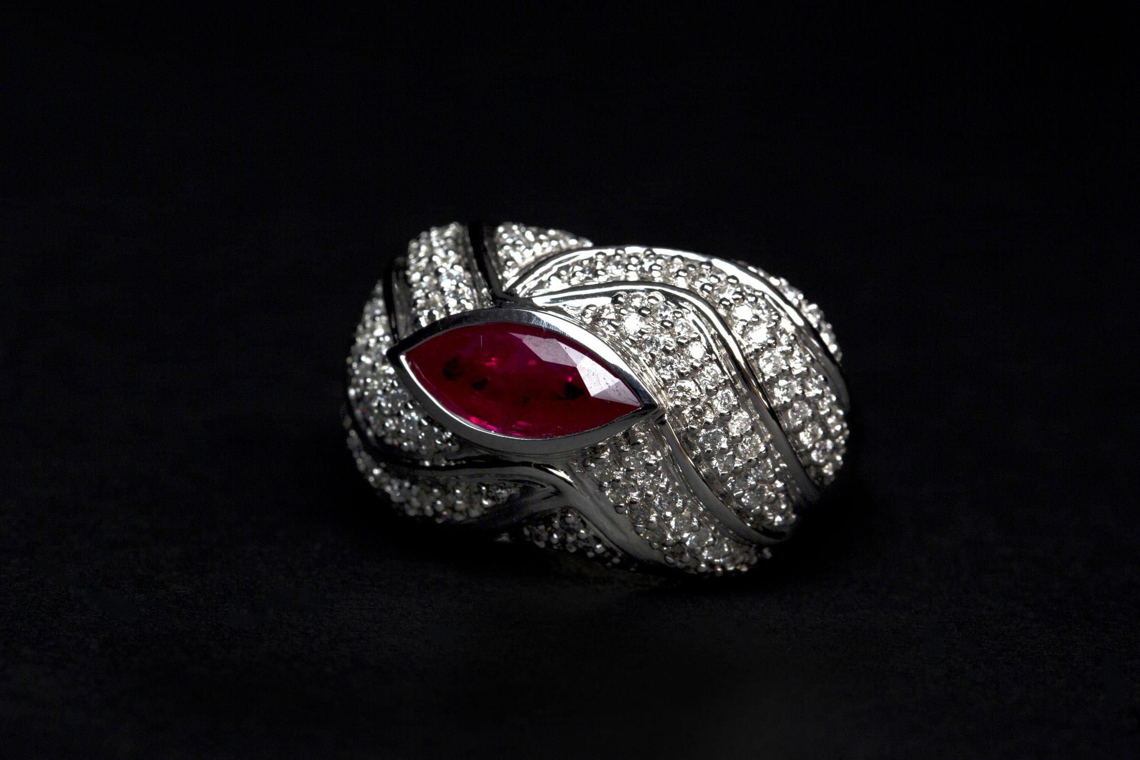 844. Bague sertie d'un rubis taille marquise (env. 1,8 ct) dans une monture pavée de diamants (env. 1,1 ct)