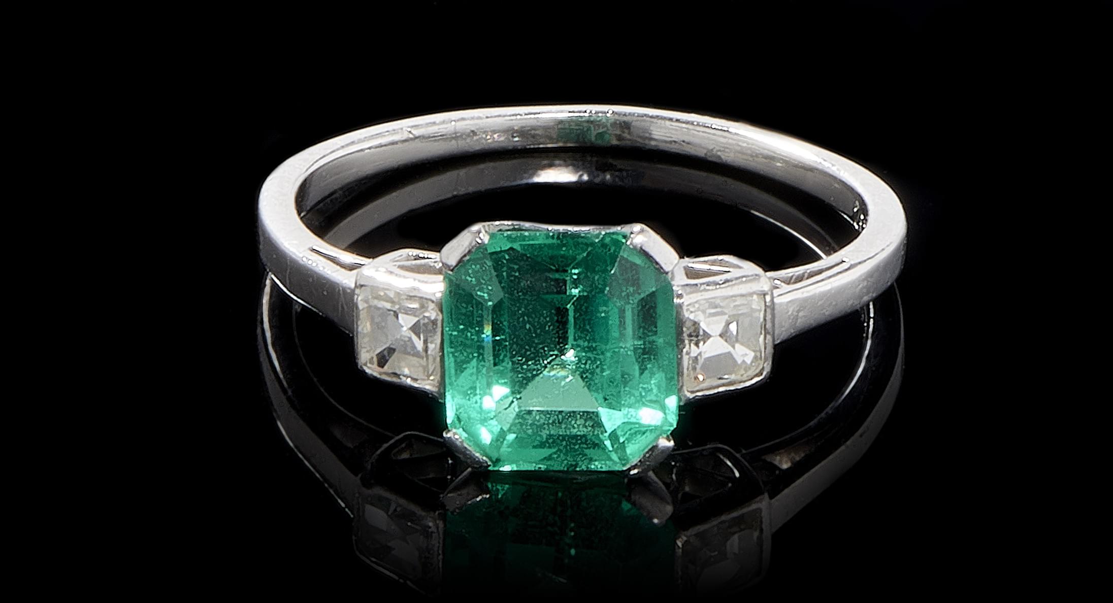 1066. Bague sertie d'une émeraude (env. 1,5 ct) épaulée de diamants