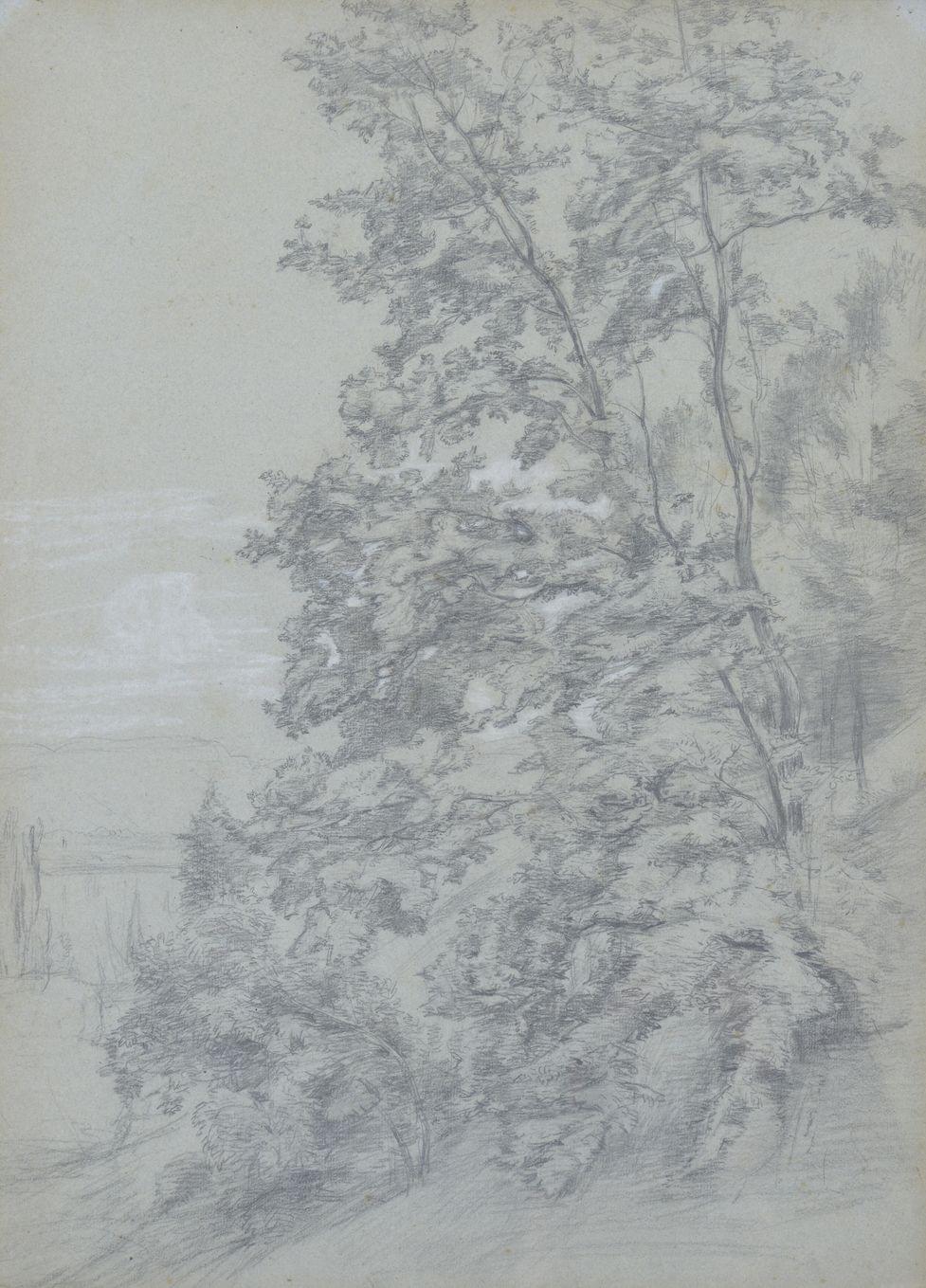 Etude d'arbre et rochers, mine de plomb et craie blanche sur pap...
