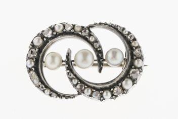 3109. Broche formant deux croissants de lune sertis de diamants en rose et de demi-perles