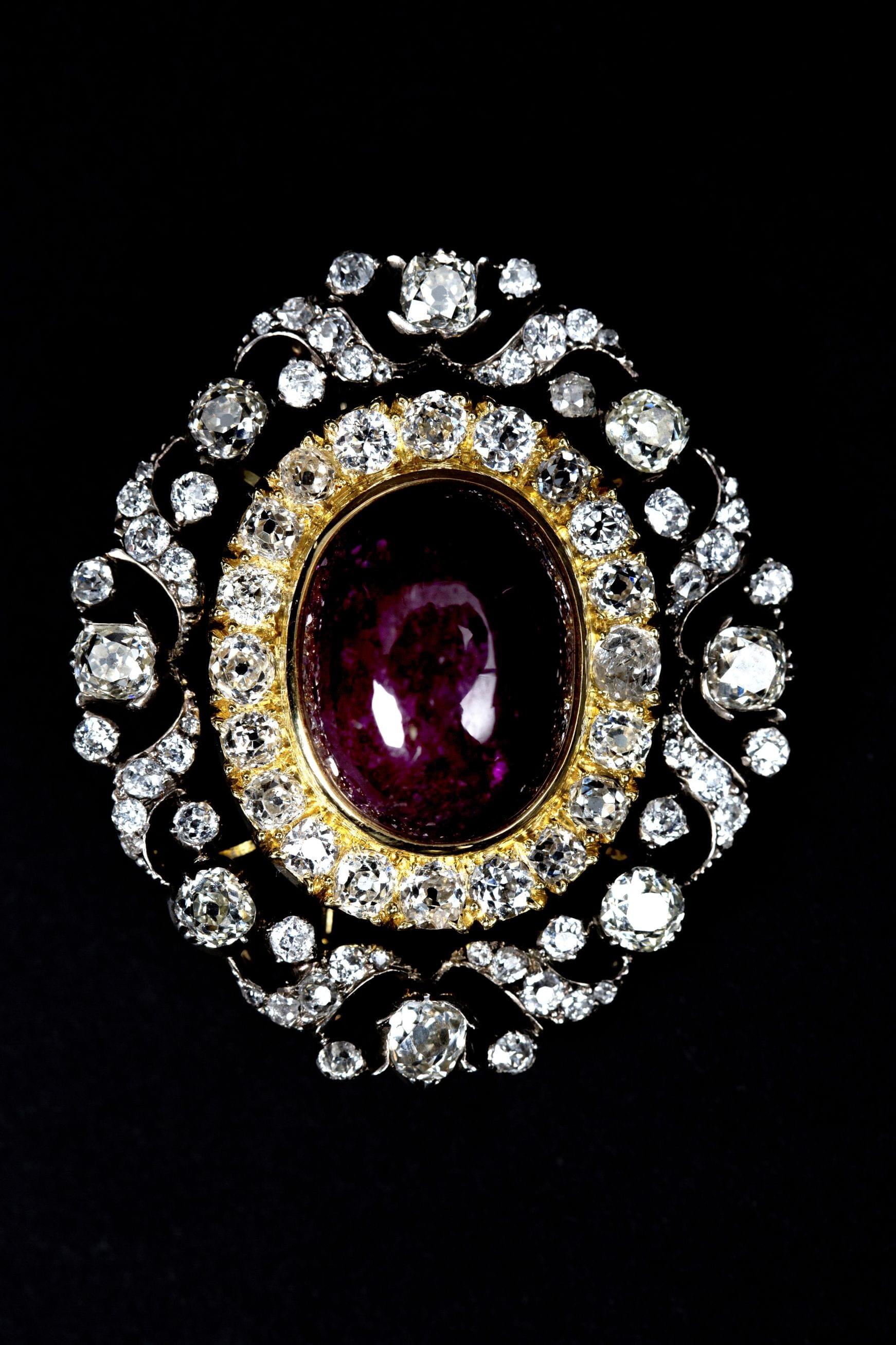 788. Broche sertie d'un rubis taille cabochon entouré de diamants taille ancienne (env. 4,5 ct)