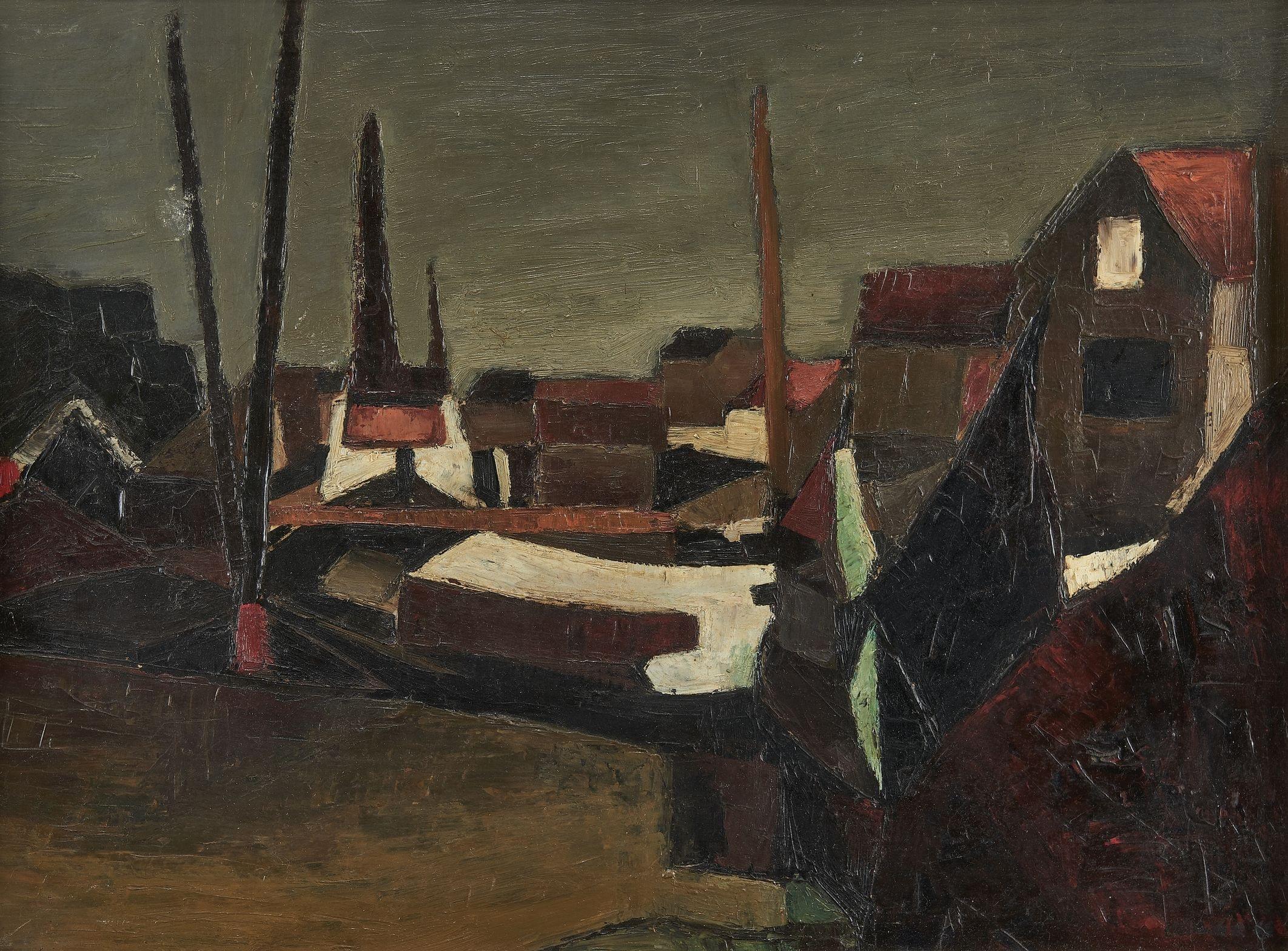 Vue d'un village, huile sur pavatex, signée et datée 69, 42x56 cm