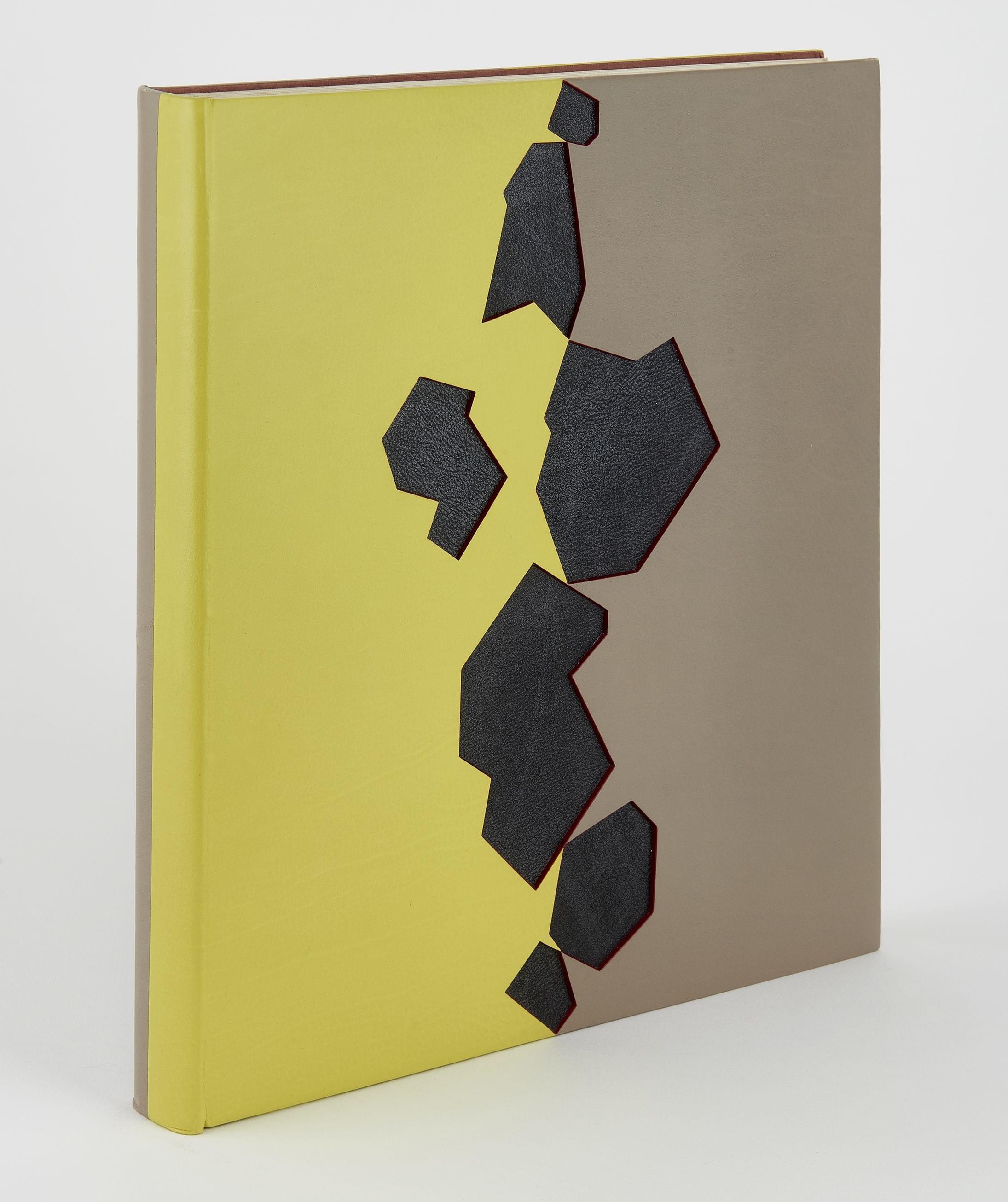 In 4°, veau gris et tilleul, à décor de médaillons géométriques en creux de maroquin anthracite cernés de filets de veau rouge, gardes de papier vergé rose, coffret. Superbe reliure de Jean-Luc HONEGGER datée de 2005.