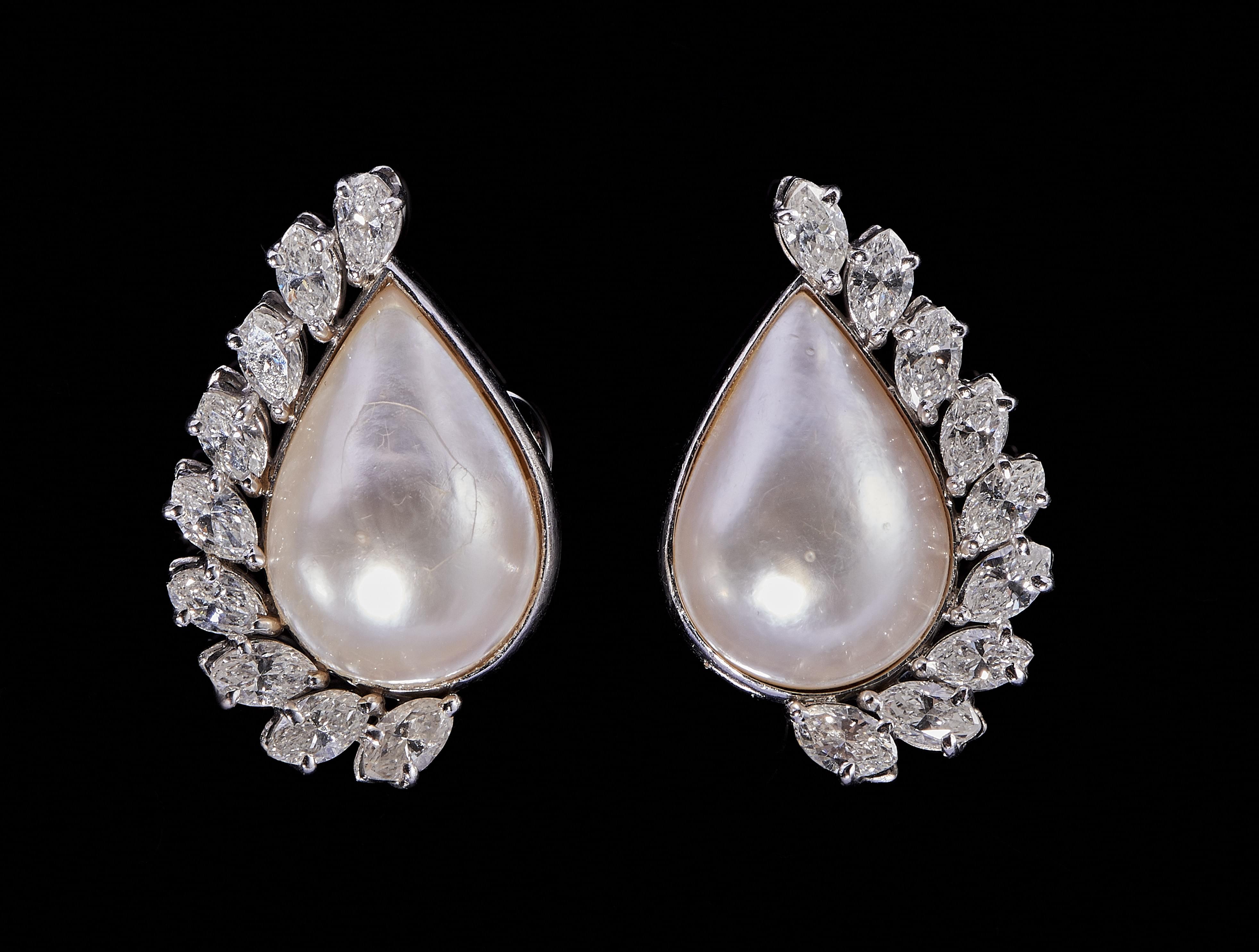 645. Clips d'oreilles sertis de perles de forme poire épaulées d'une ligne de diamants taille marquise (env. 2,5 ct)