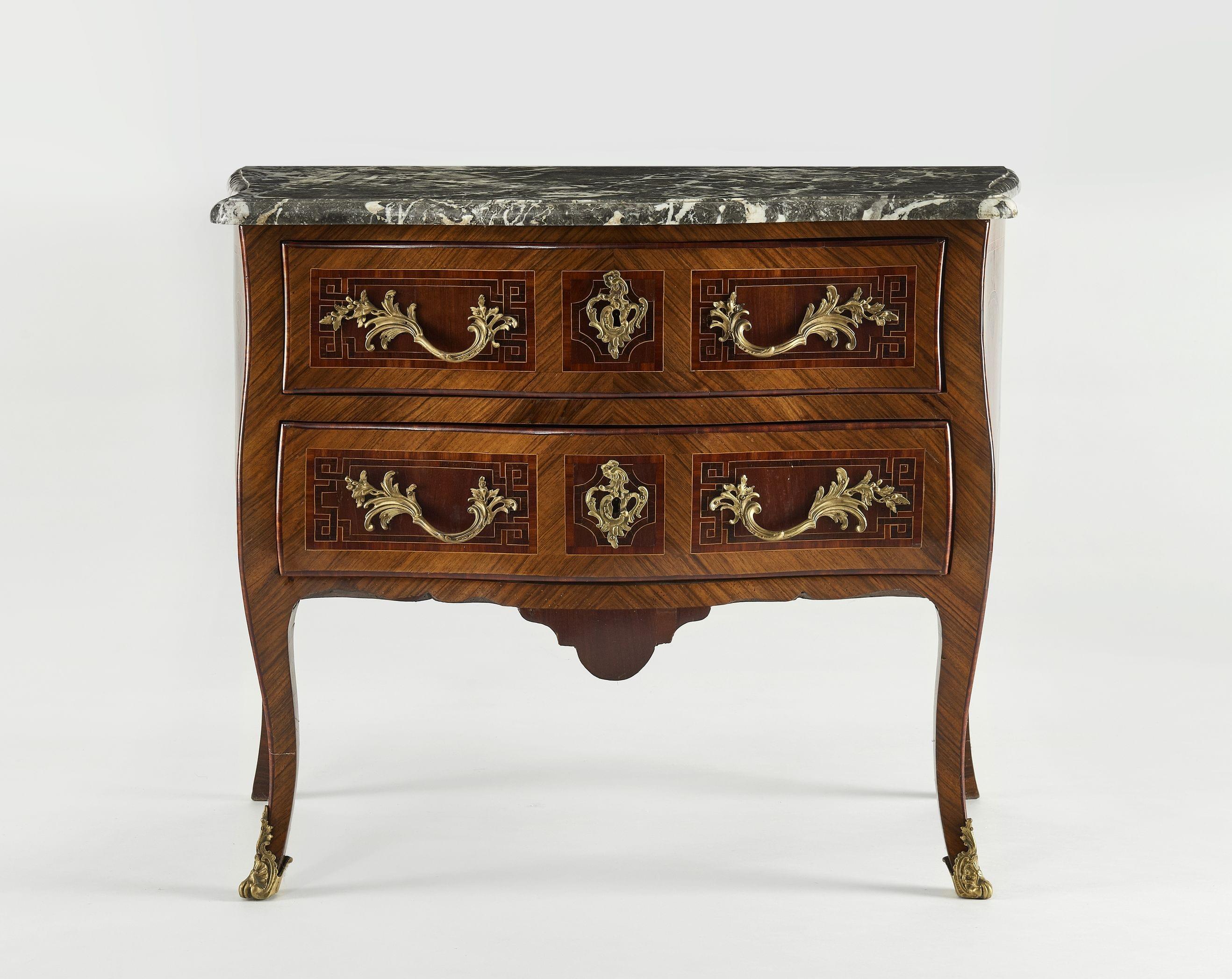 Deux tiroirs, bois fruitier marqueté dans des encadrements de filets, bronze doré, marbre gris veiné blanc, 84x100x55 cm