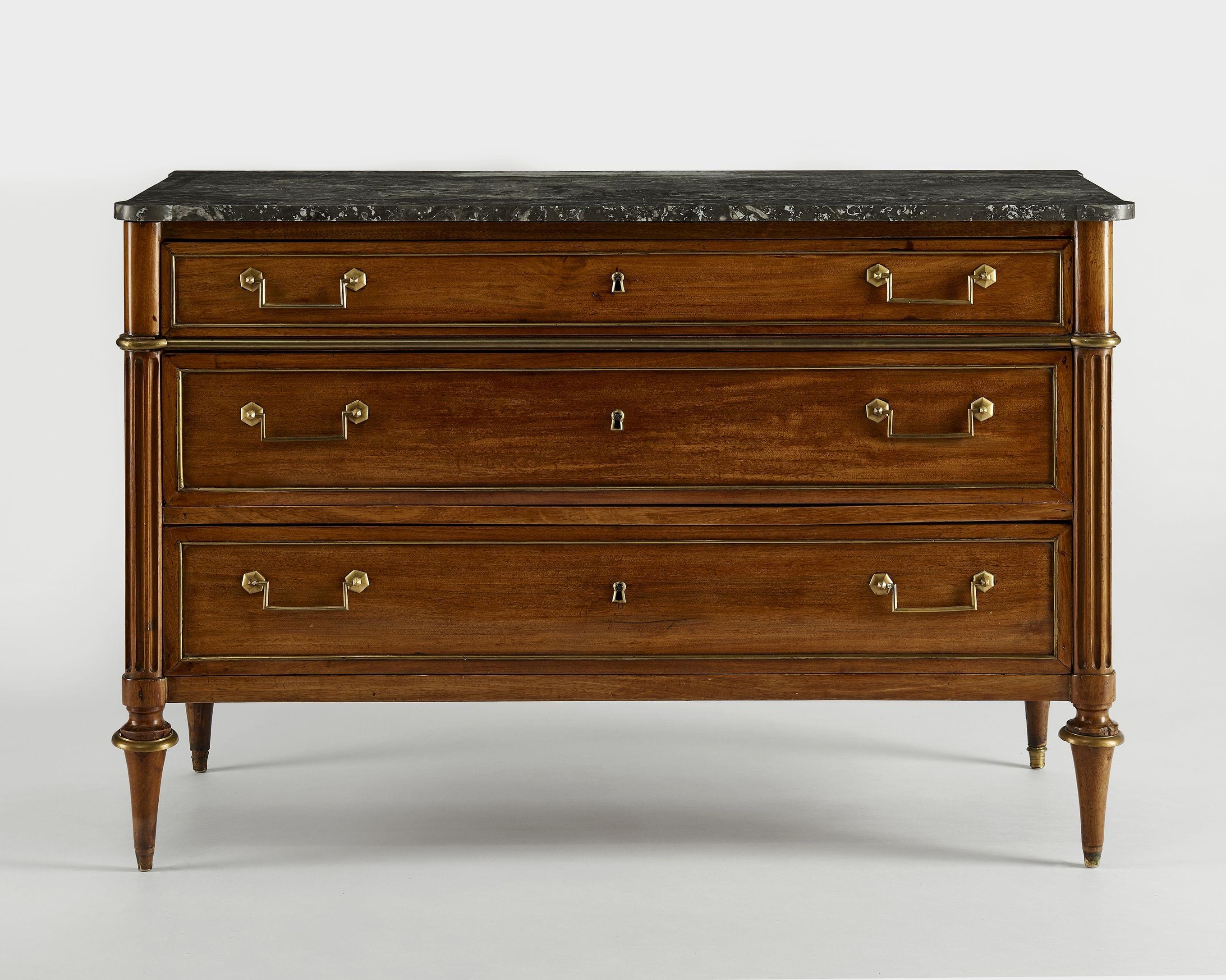 Trois tiroirs, acajou, laiton et marbre, 87x127x60 cm