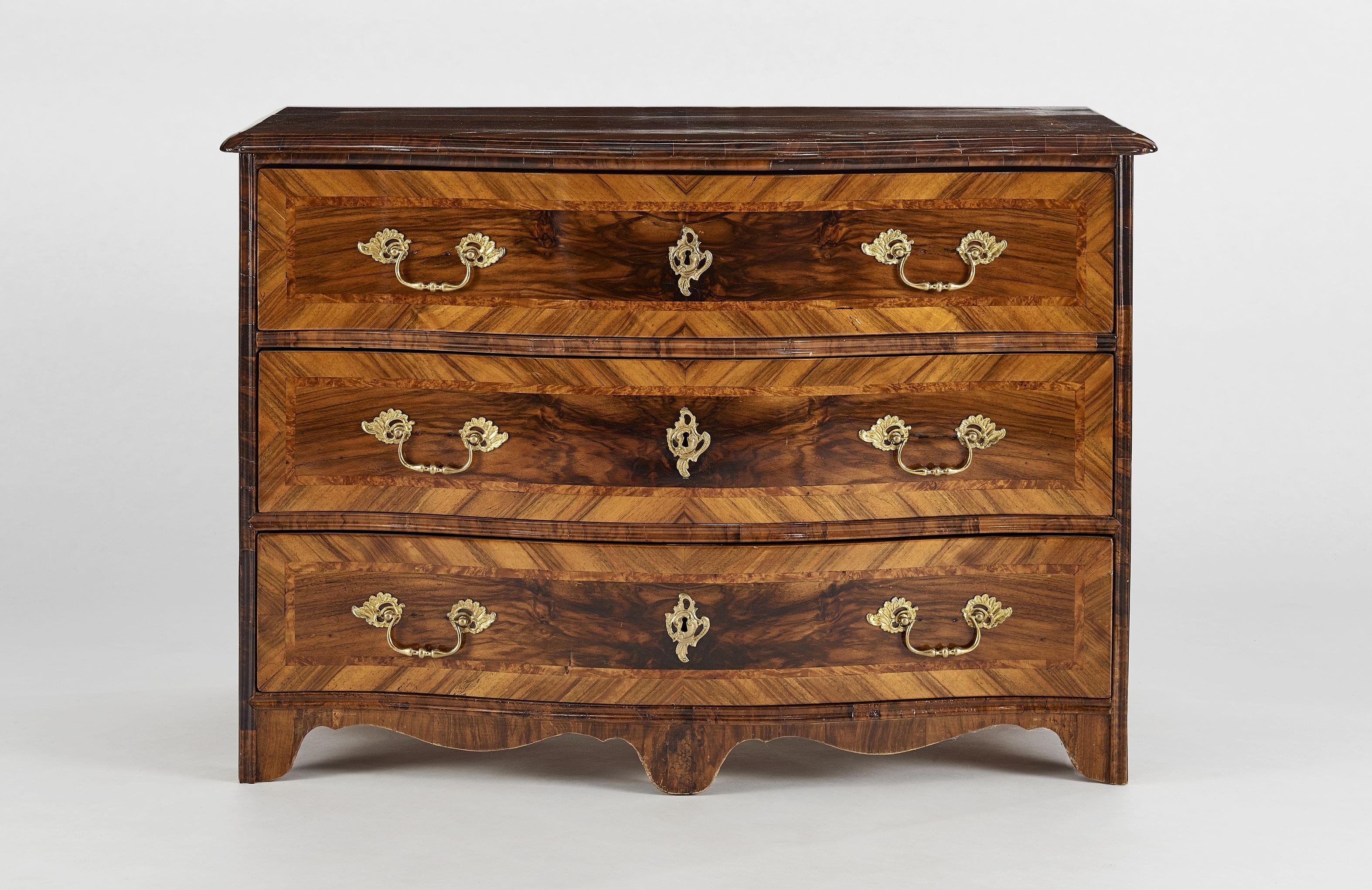 Trois tiroirs, façade galbée, bois fruitier et bronze, 89x123x67 cm. Provenance: collection Pernet-Villaverde