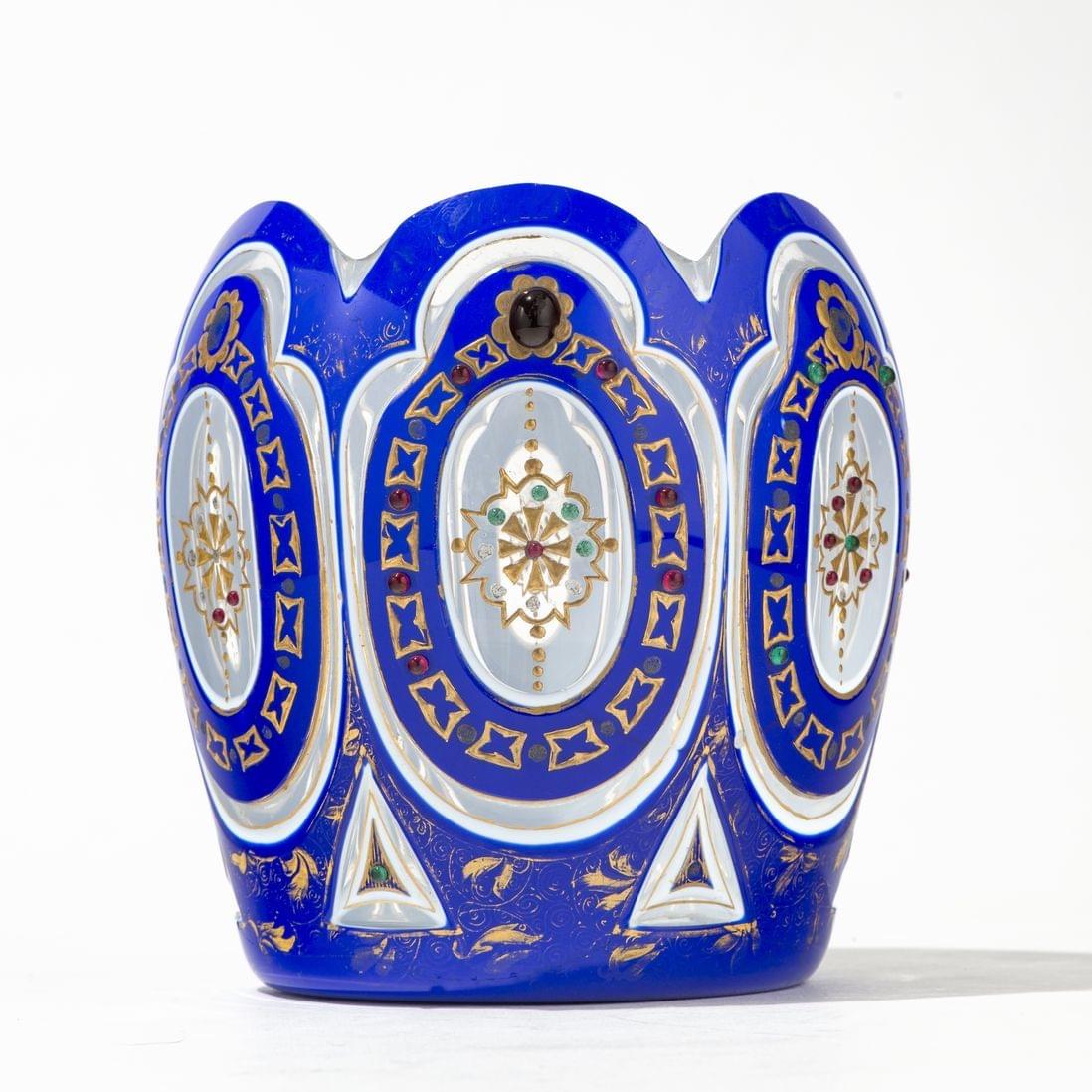 Cristal de Bohême overlay bleu et blanc à décor doré, pour le marché perse, H 15,5 cm