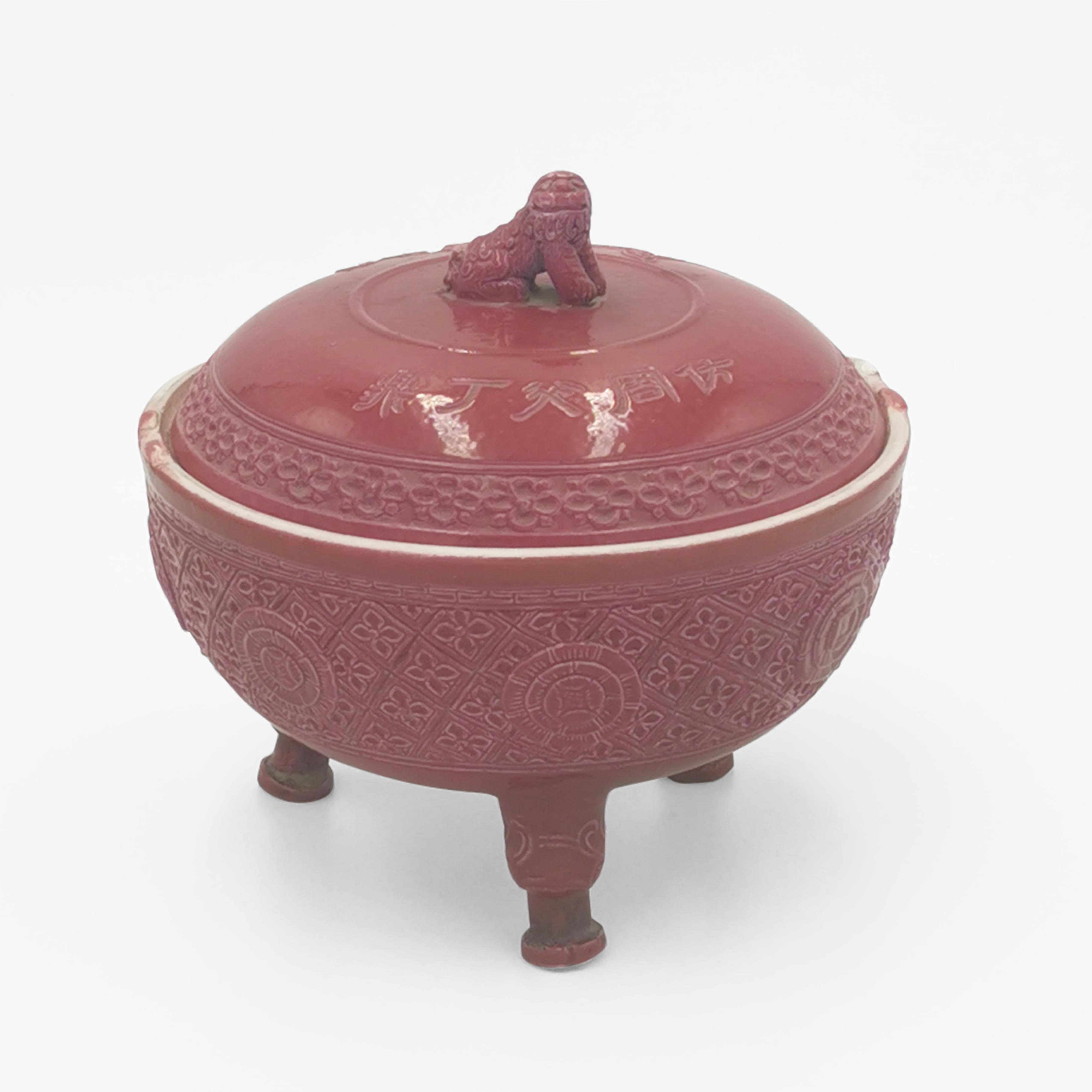 Porcelaine émaillée monochrome framboise à décor de fleurons, frétel chien de Fô, anses rognées, H 14 cm