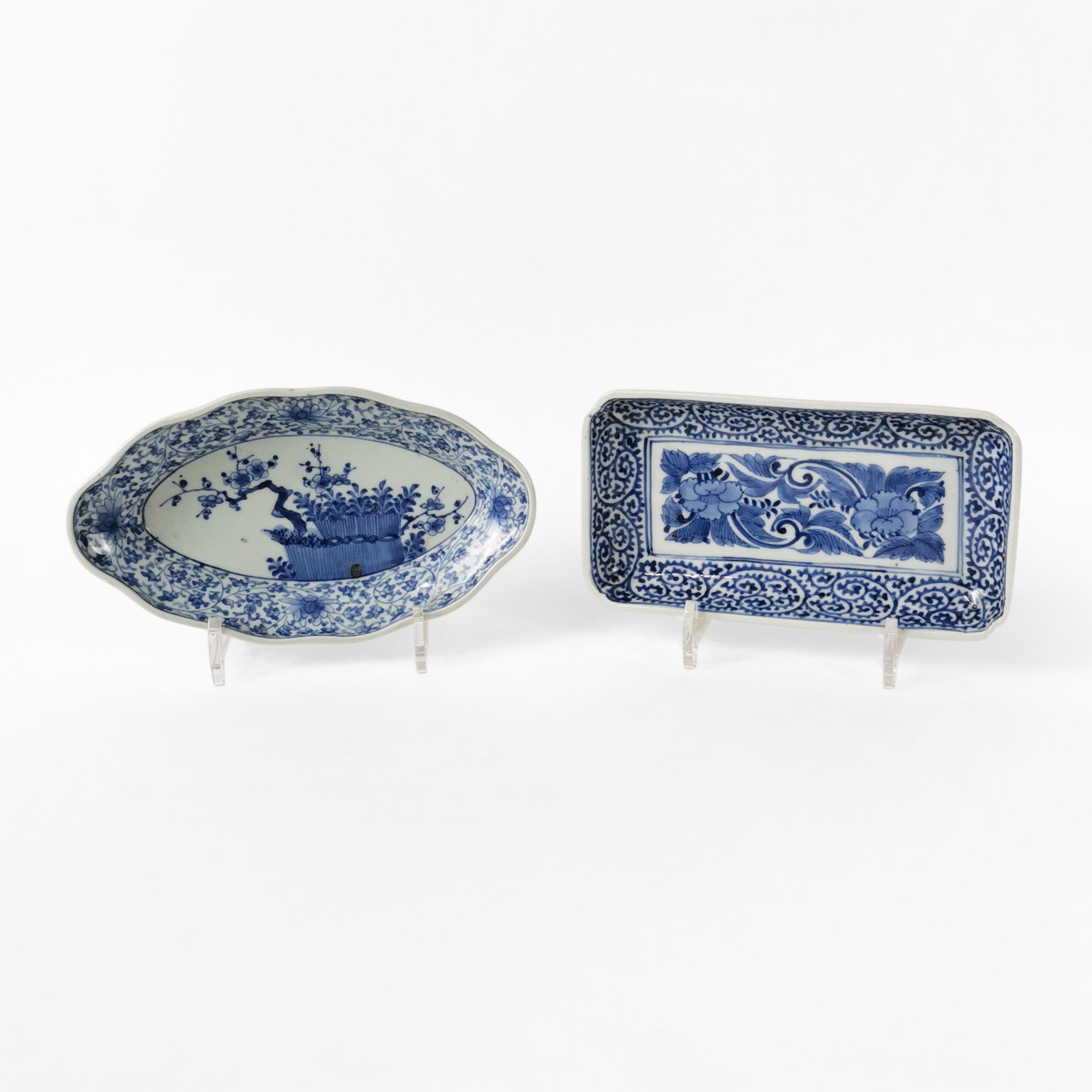 Porcelaine émaillée bleu blanc, L 21 et 23 cm