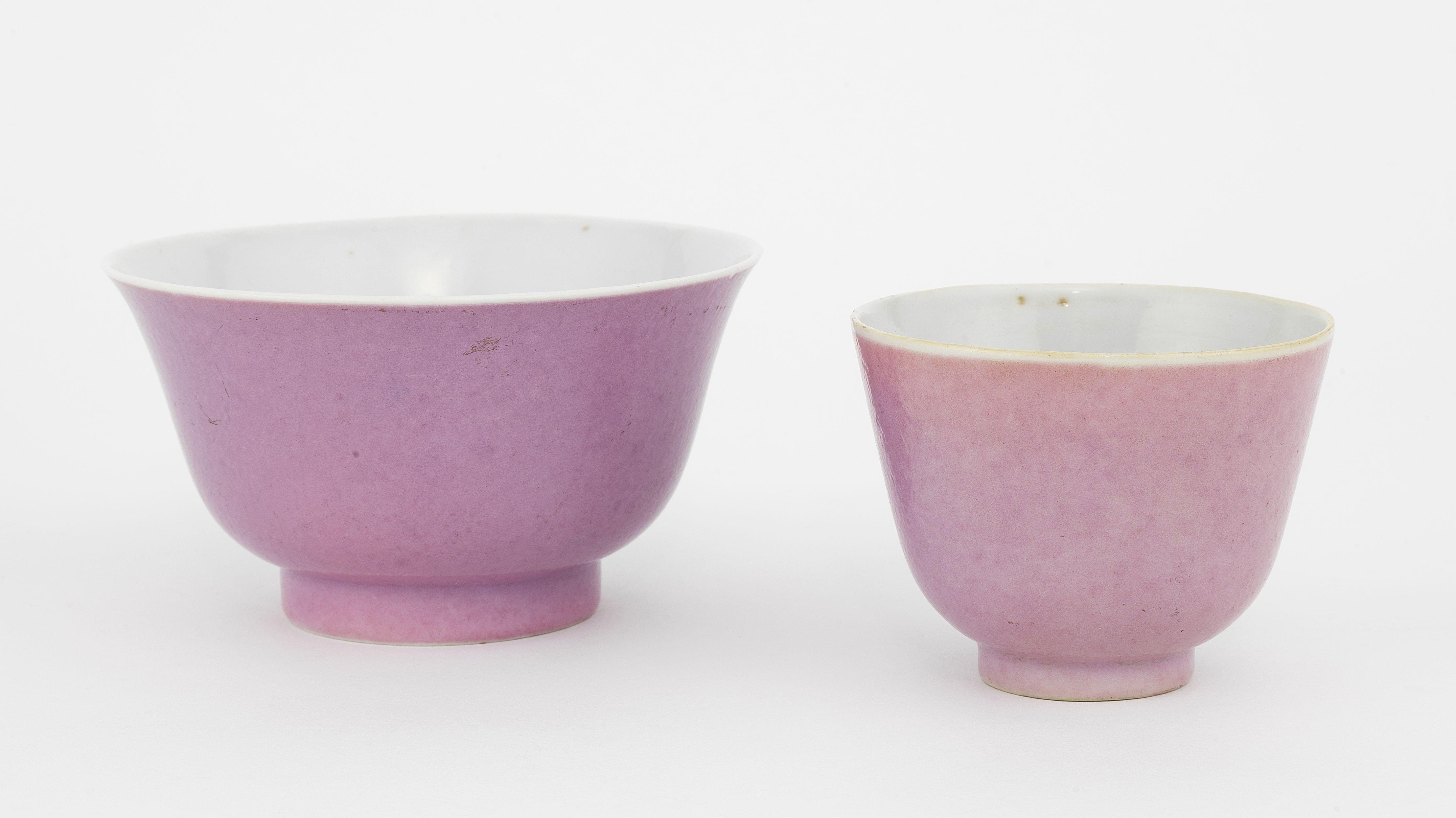Porcelaine émaillée monochrome rose, l'une avec une marque Guangxu en rouge fer sous la base,
