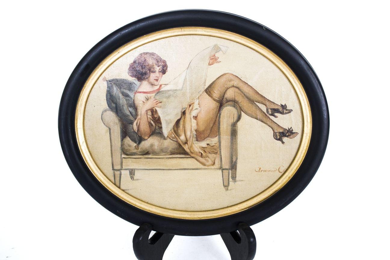 Lecture sur le divan, huile sur pavatex, signature non identifiée, 20x25 cm