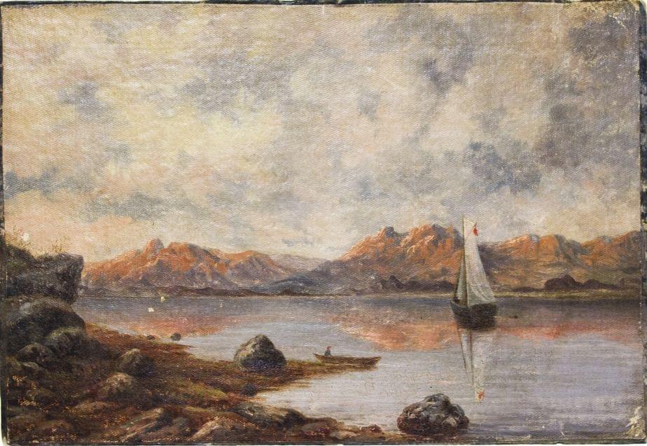 Coucher de soleil sur les bordures du lac, huile sur toile marouflée sur carton, 22x32 cm