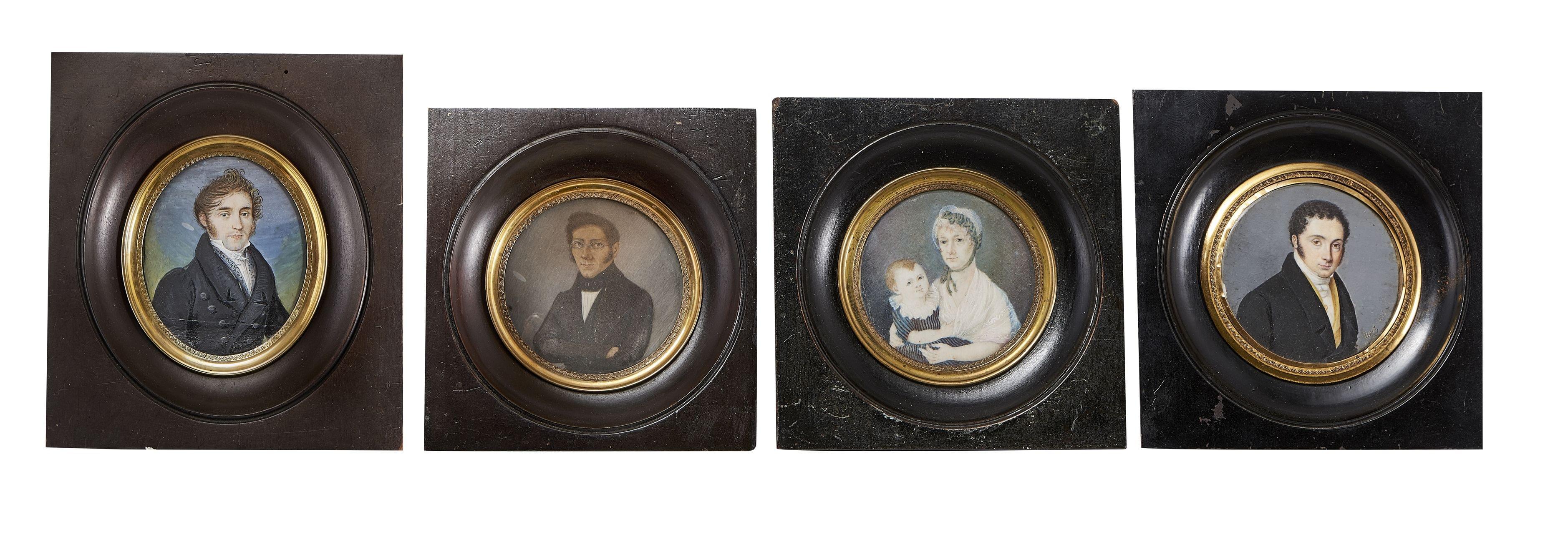 Miniatures à la gouache sur ivoire, XIXe s, l'une signée Finot et datée 1824, D 6,5 cm. Provenance: collection Pernet-Villaverde