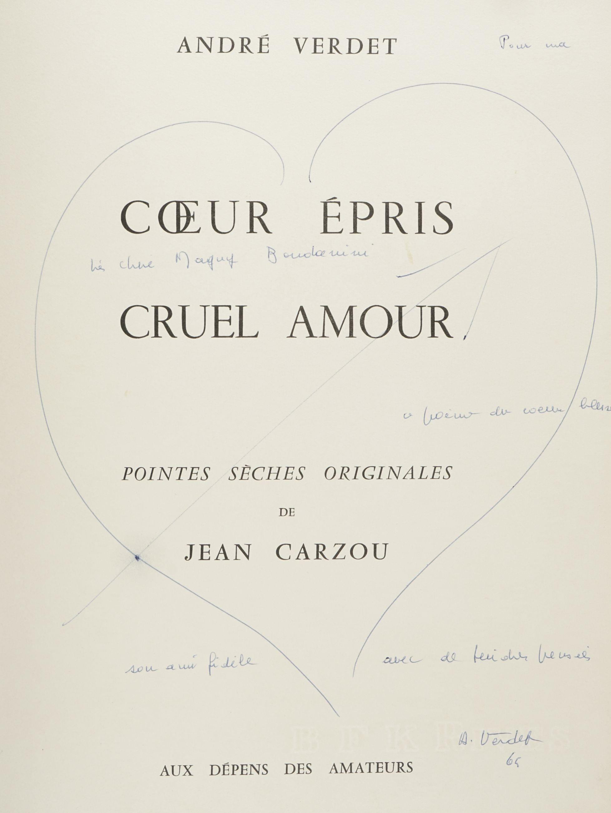 - CARZOU. VERDET (André) et CARZOU (Jean) : Cœur épris, Cruel Amour. Nice, 1965 ; in-folio, en feuilles, sous chemise et portefeuille de toile bleue. Edition tirée à 130 ex. num., celui-ci est un des 110 ex. sur vélin B.F.K. de Rives, signés par l’artiste et l’auteur. Il est enrichi, en outre, d’un très beau dessin à pleine page, dédicacé et signé par Carzou, et d’un bel envoi signé par Verdet. - MIRO. MIRO à l’encre. Texte d’Yvon Taillandier. Paris, 1972 ; in-4°, broché. Lith. originale en front. - MIRO. Juan Miro, Œuvre graphique… Genève, 1961 ; in-8° broché, couv. ill. Portrait de l’artiste en front. photographié par Luc Joubert.