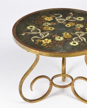 Guéridon rond, fer forgé et verre églomisé, circa 1960, H 50, D 61 cm