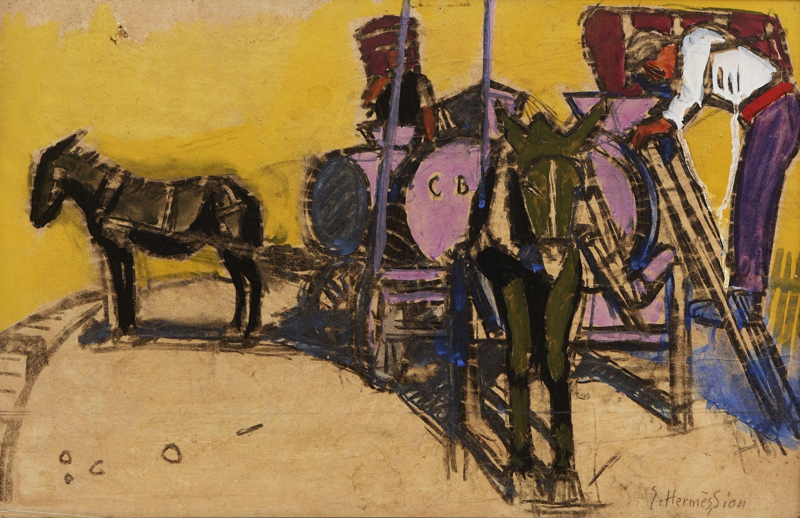Café à Athènes, gouache et fusain sur papier, signé et daté 67,...
