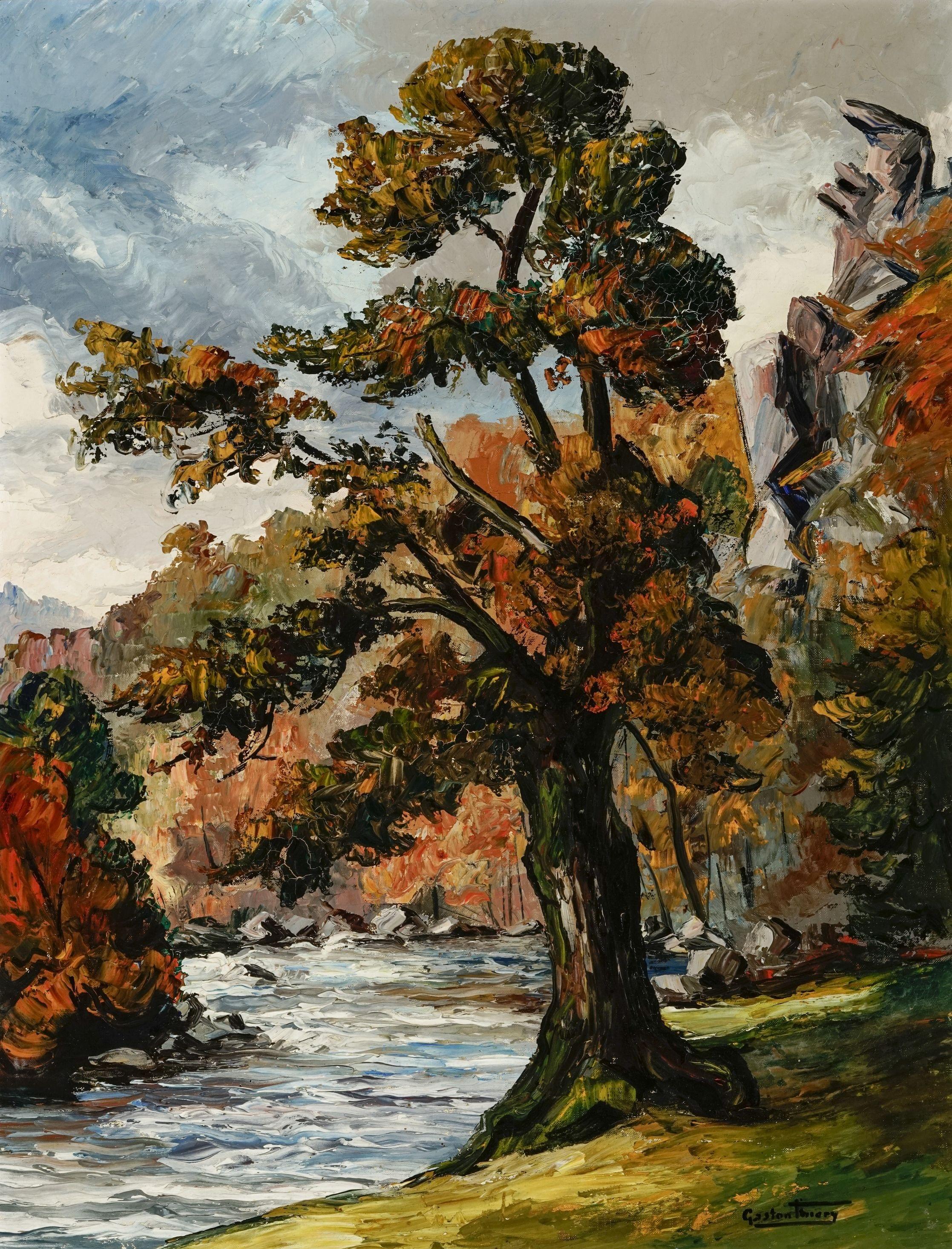 Arbres près de la rivière, huile sur toile, signée, 63x49 cm