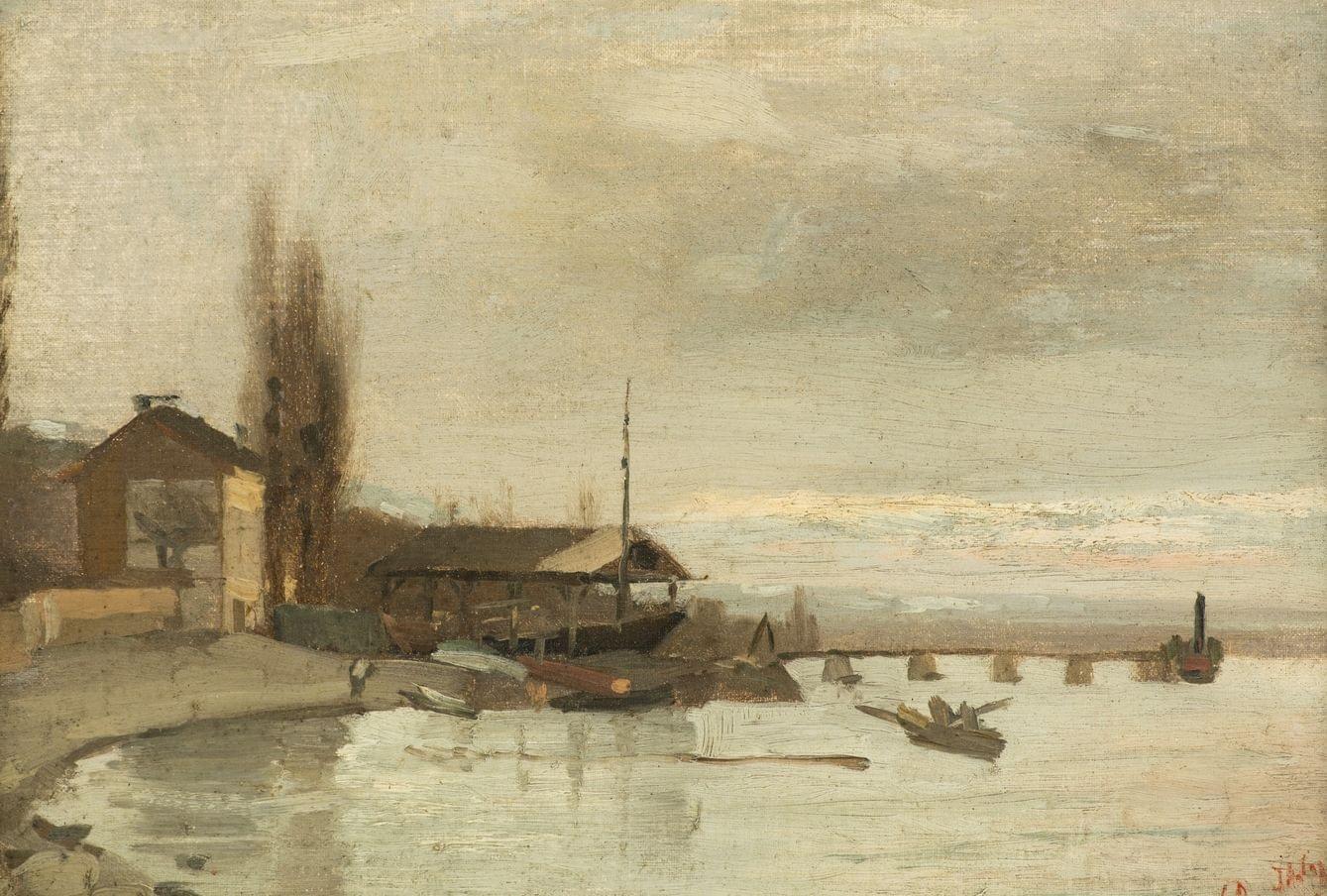 Le débarcadère sur le Léman, huile sur toile signée, 22x31 cm