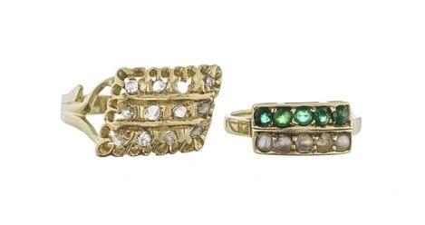 3154. Lot de deux bagues anciennes, l'une sertie de diamants en rose, l'autre sertie d'émeraudes et demi-perles