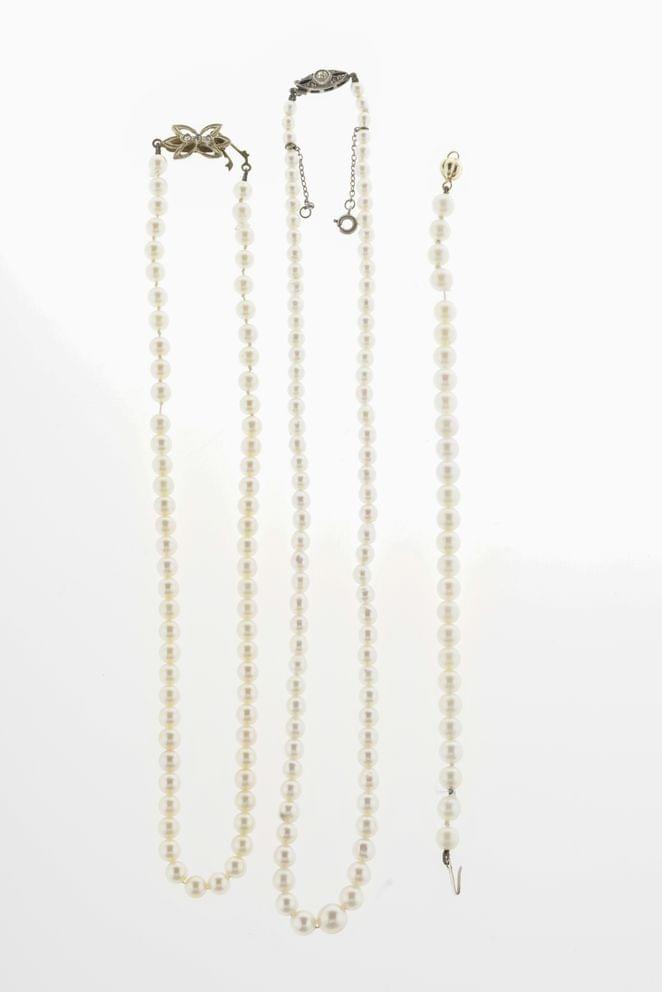 3169. Lot de deux colliers de perles dont un en chute, et d'un bracelet de perles. Les fermoirs sont sertis de pierres d'imitation.