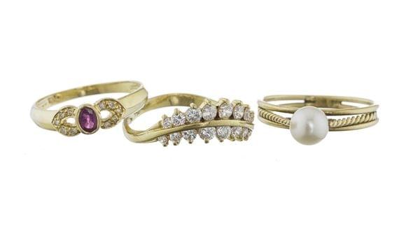 3207. Lot de trois bagues, une sertie d'une perle, une sertie d'un rubis épaulé de diamants et une sertie de diamants d'imitation