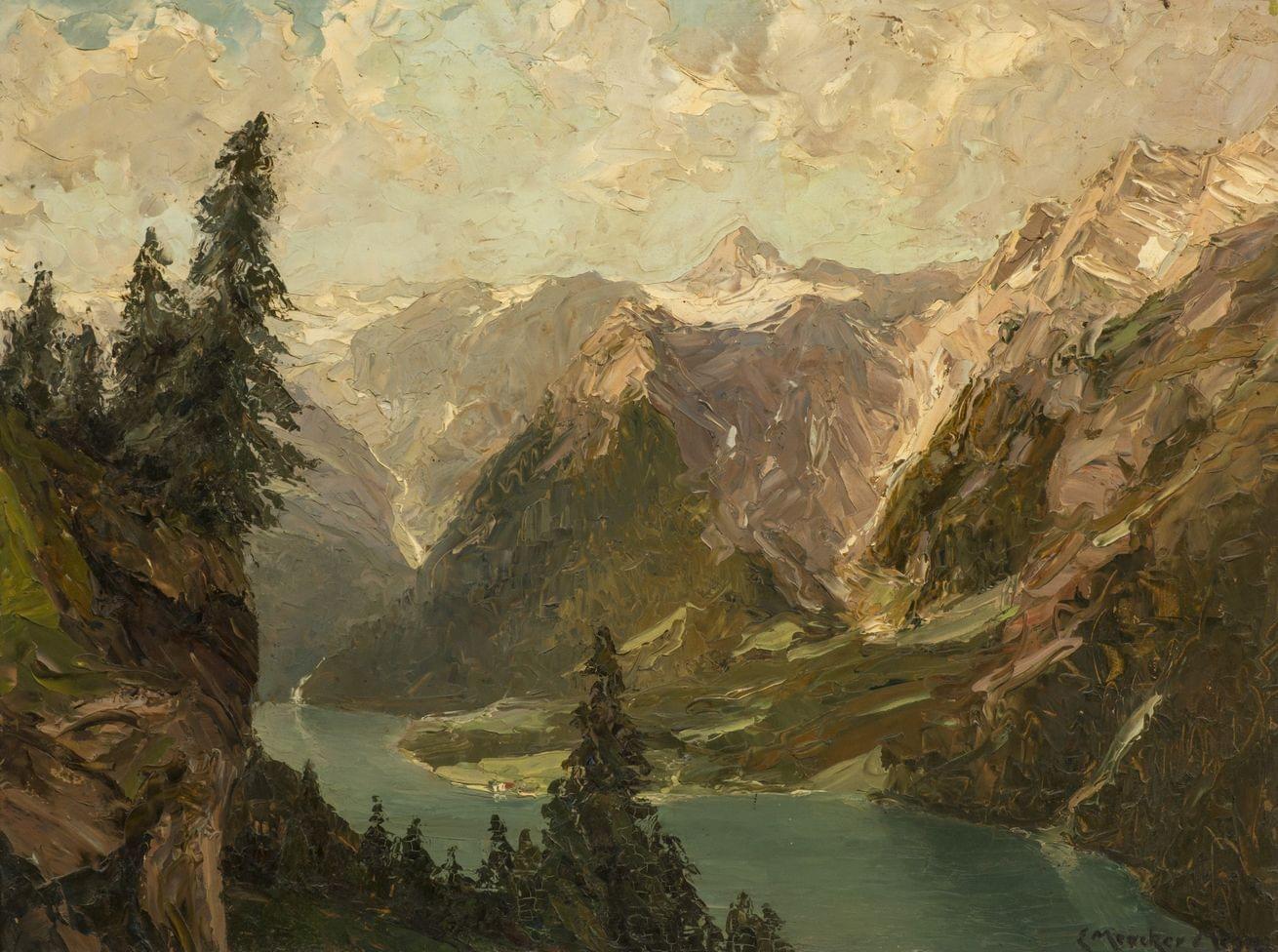 Lac alpin et montagnes enneigées, huile sur toile signée, 77x104...