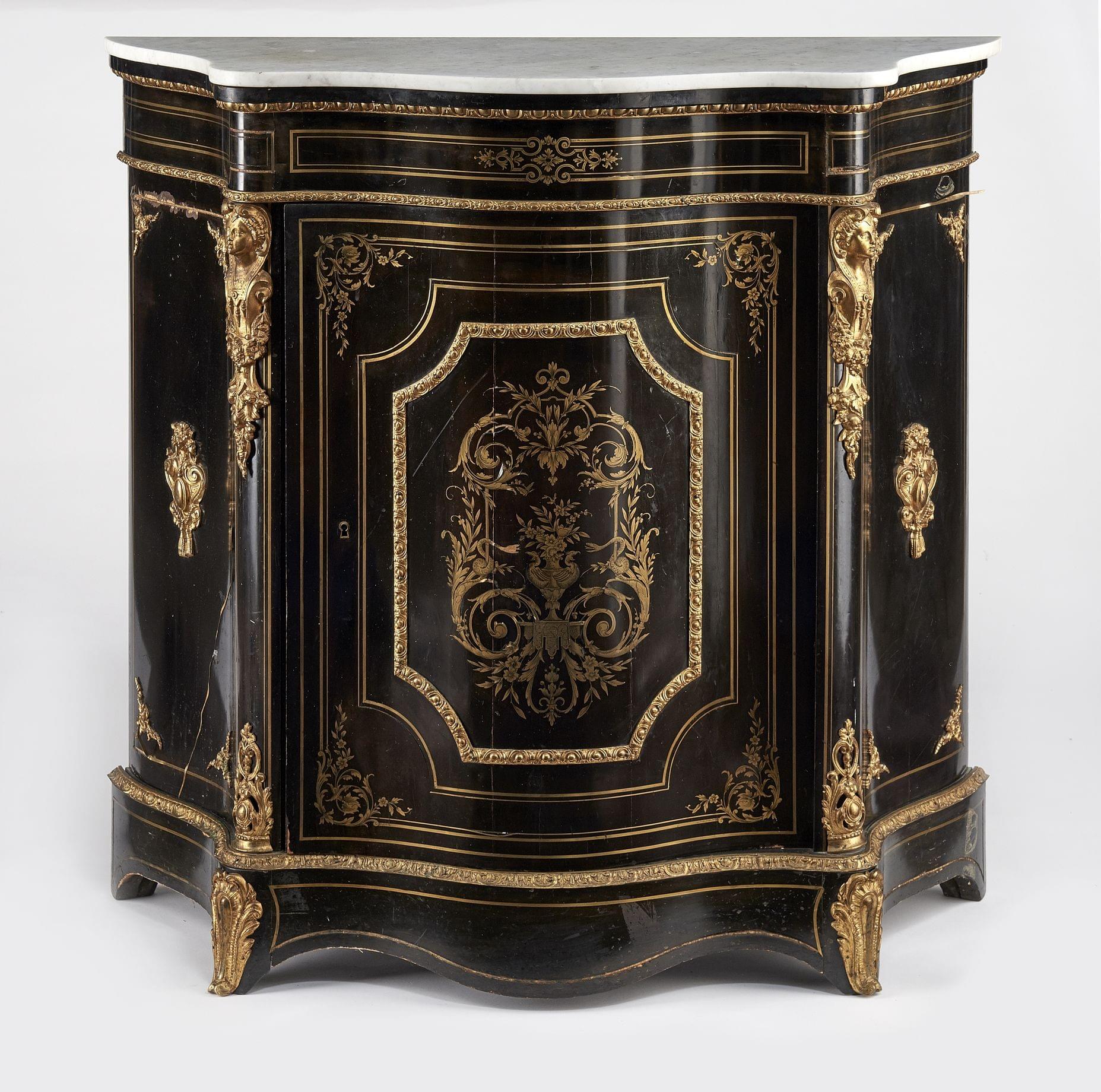 Bois noirci, bronze doré et marbre blanc, 106x107x43 cm