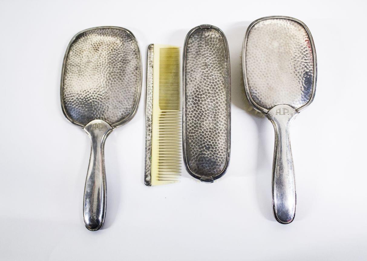 3282. Nécessaire de coiffeuse comprenant: deux brosses, un peigne et un miroir à main