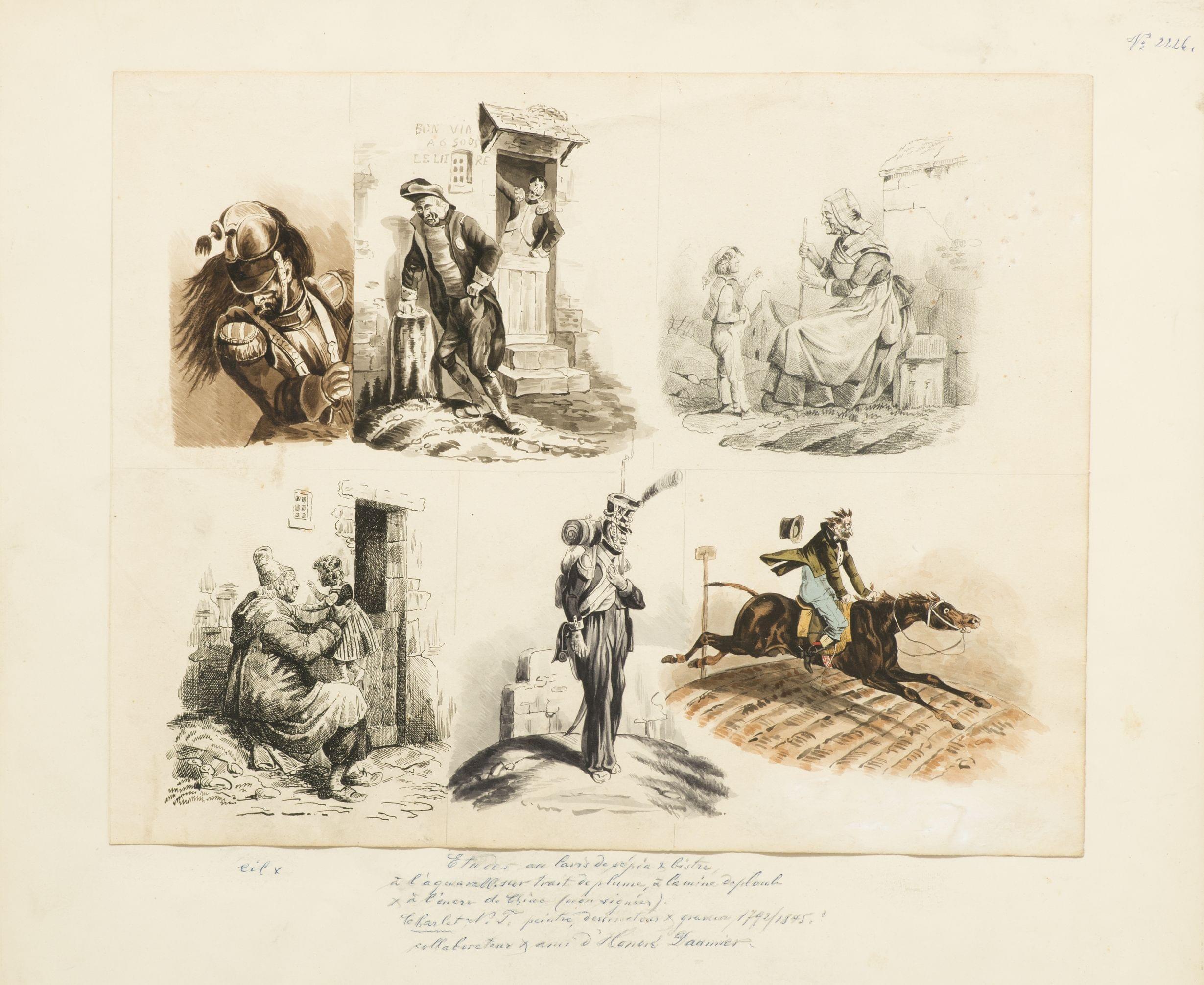 Etude de scènes de vie, mine de plomb, aquarelle, lavis d'encre et encre de Chine, 26x33 cm