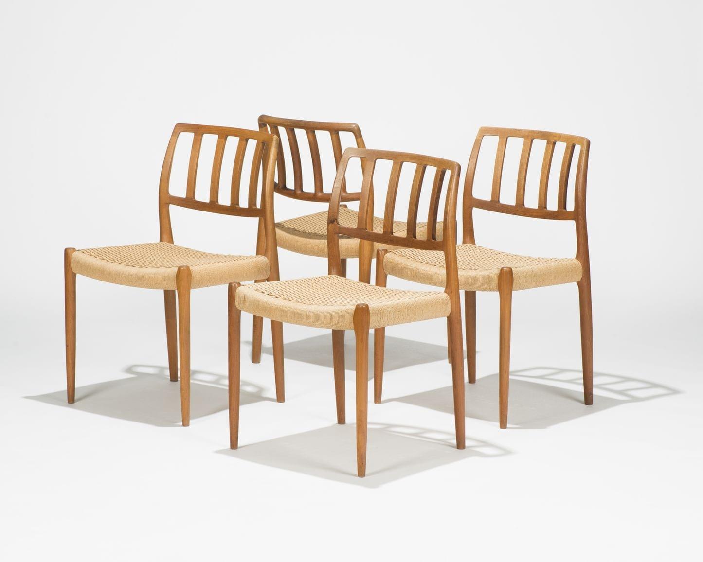 Suite de 4 chaises 83, teck, corde tressée, estampillées