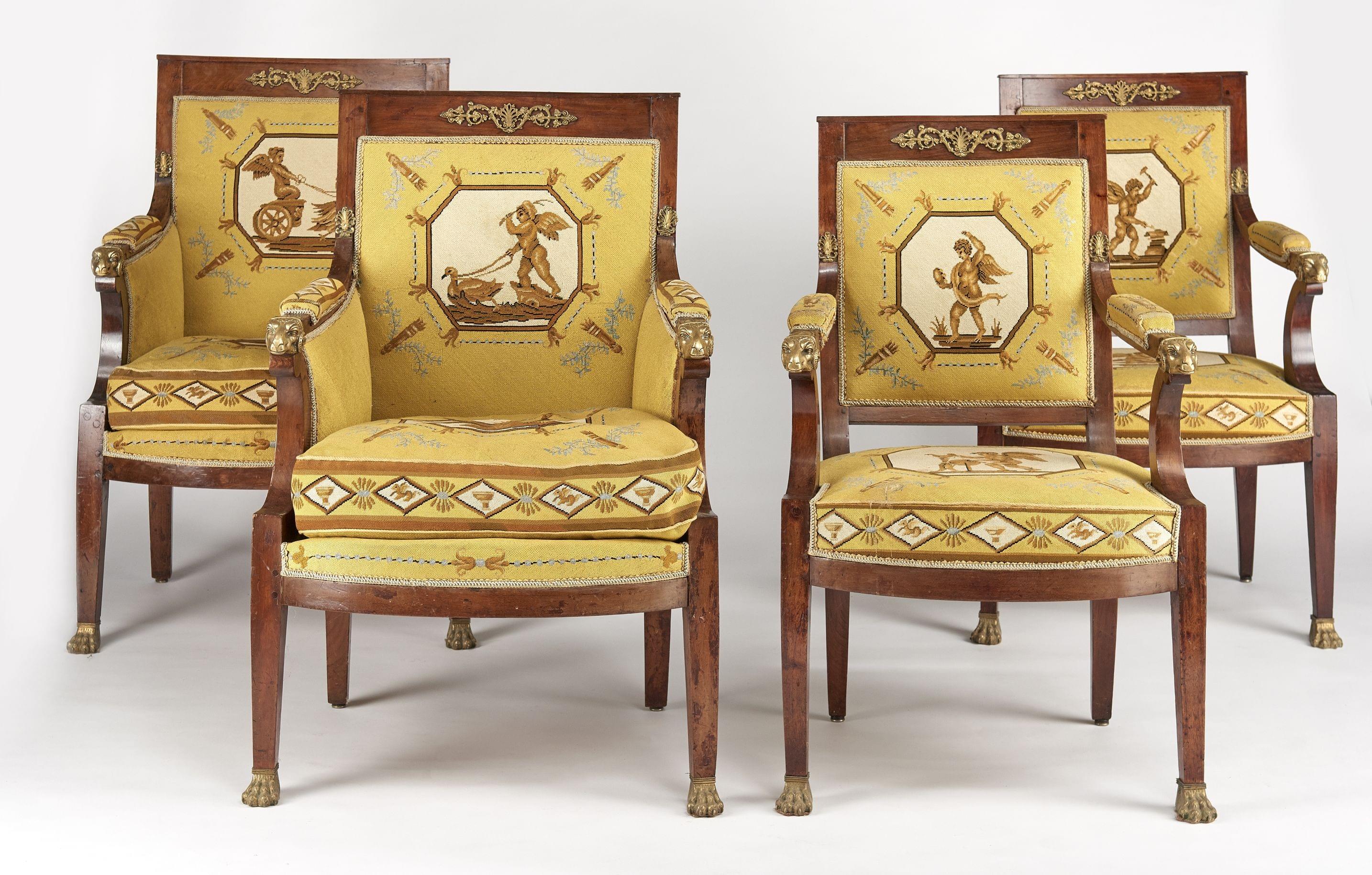Accotoirs en tête de mufles, garniture au petit point à décor de putti travailleurs sur fond jaune, acajou