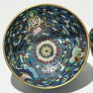 Emaux cloisonnés sur cuivre à décor de bouddha dans des nuées, marque Ming apocryphe, D 19 cm. Provenance: Château fribourgeois