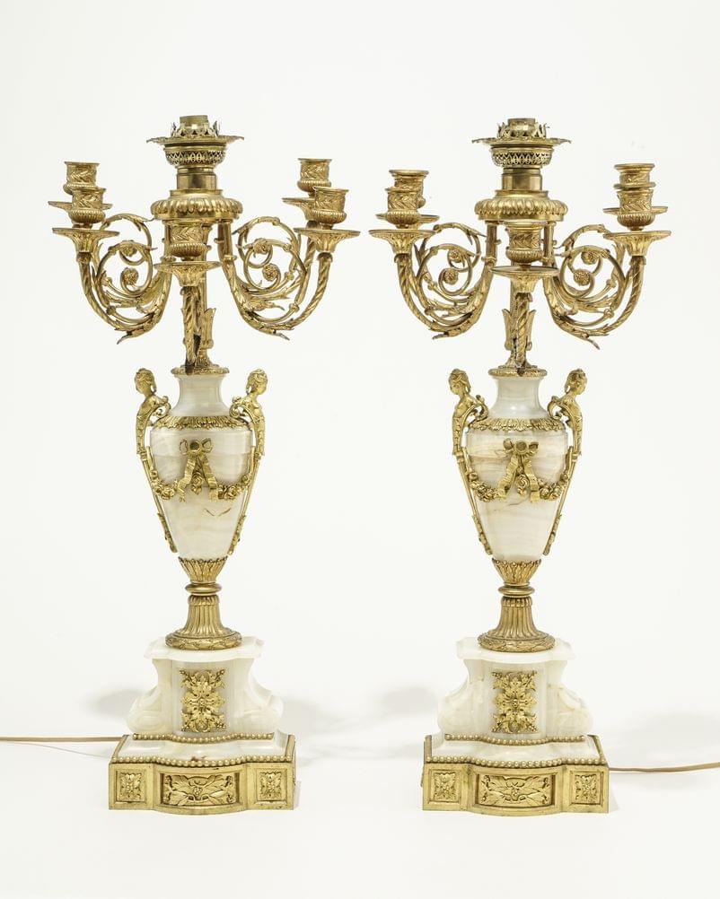 Fût de forme balustre supportant six lumières, albâtre et bronze doré, H 90 cm