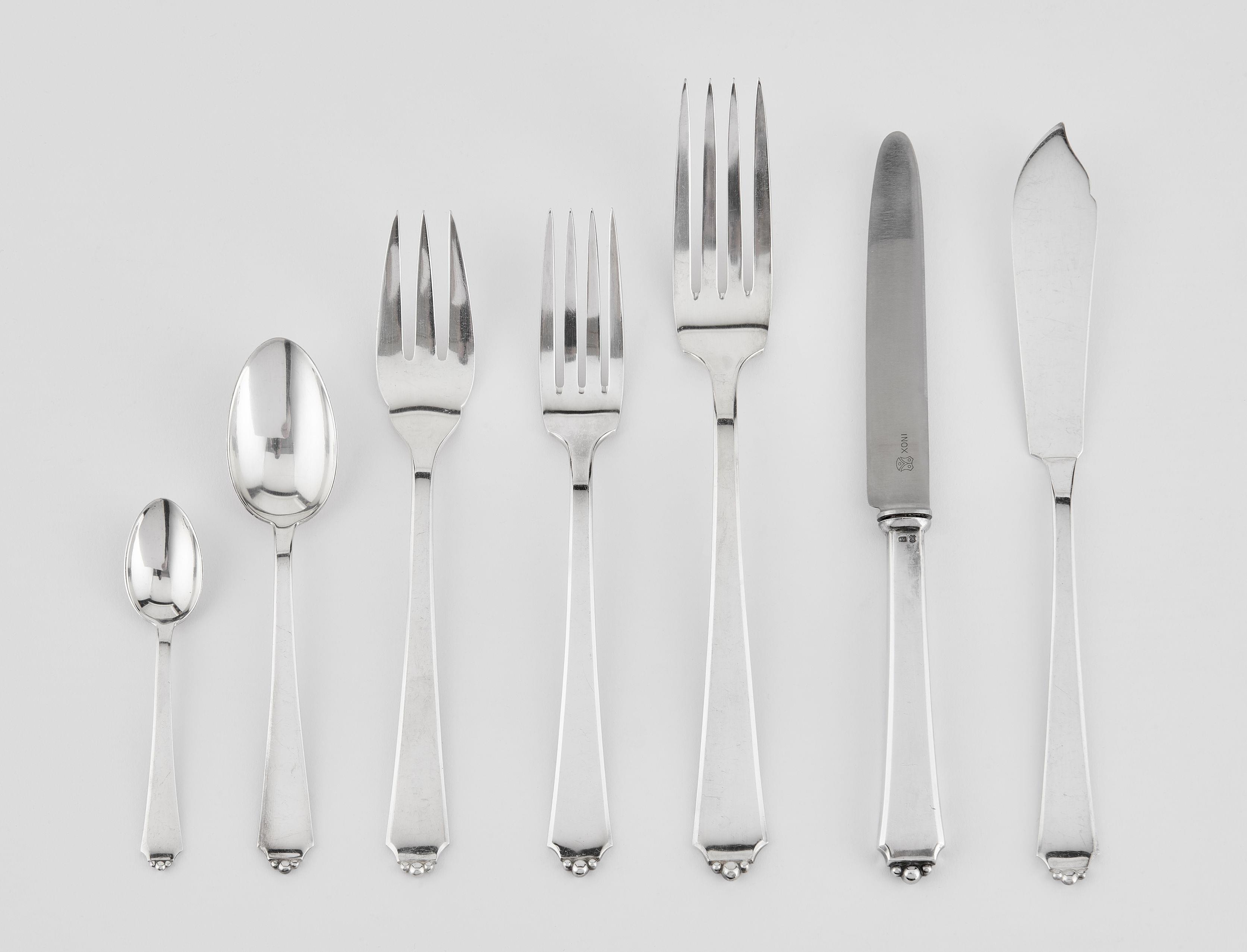 Jezler, argent 800, comprenant: 6 fourchettes à dîner, 6 fourchettes et 8 couteaux à entremets, 12 fourchettes et 12 couteaux à poisson, 18 cuillères à thé, 12 à café, 35 pièces de service, 4100 g.