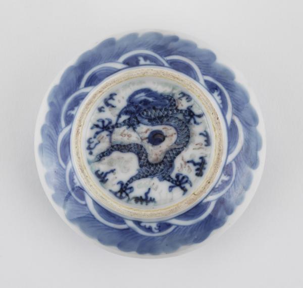 Porcelaine émaillée bleu et rouge à motif de dragons poursuivant la perle sacrée, D 9 cm