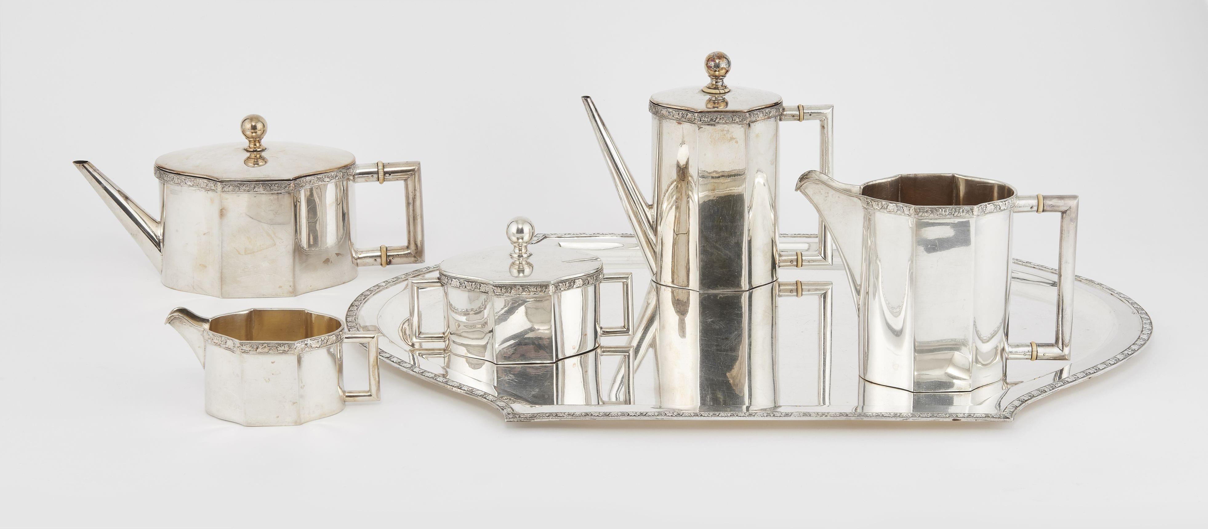 Autriche-Hongrie, argent, comprenant: théière, cafetière, verseuse, sucrier, pot à lait et plateau, L 60 cm, 4140 g