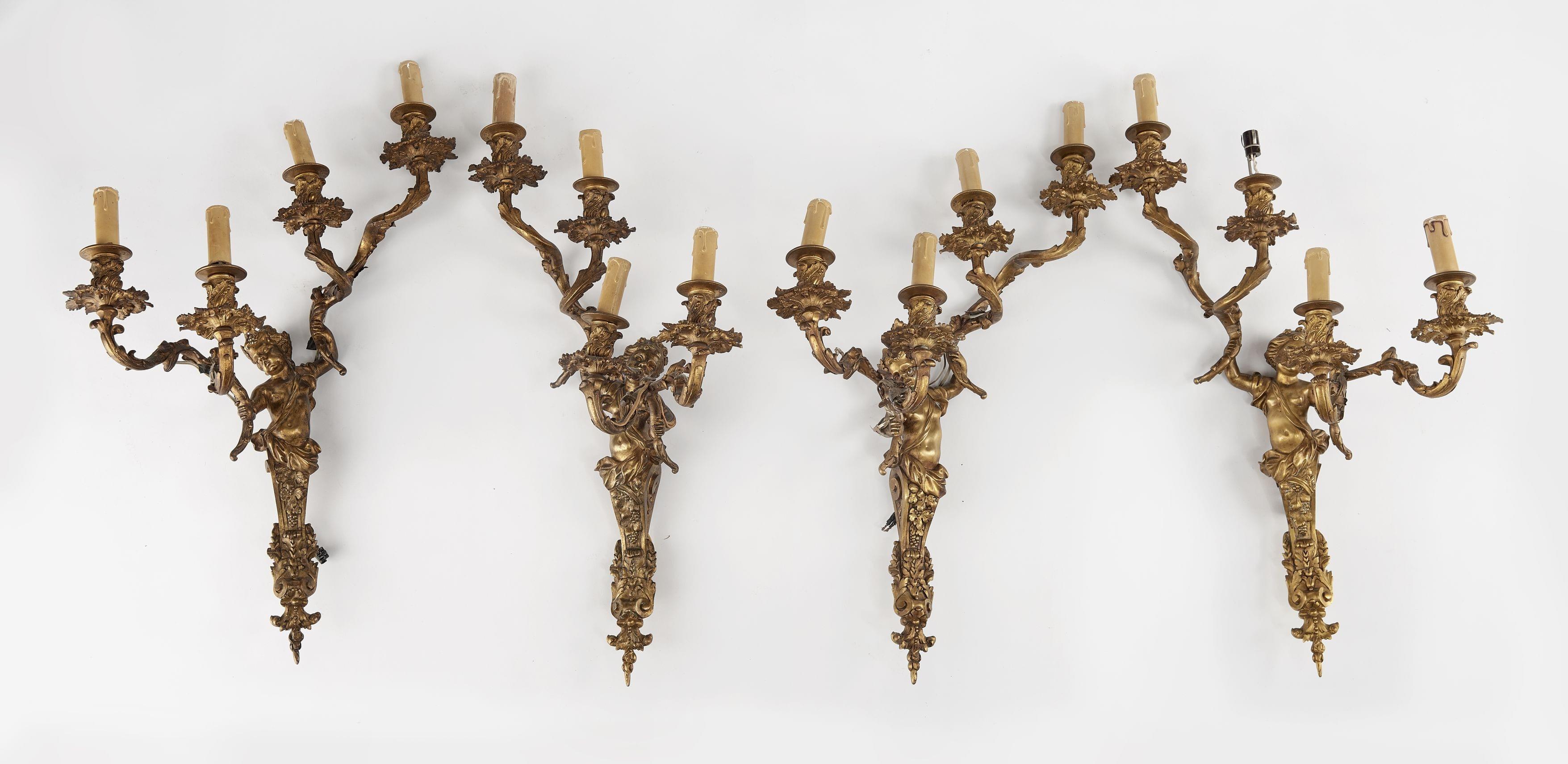 Trois lumières tenues par un putto, bronze doré, H 67 cm
