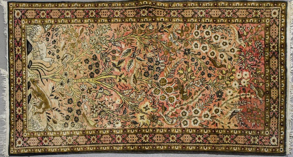 A décor d'un arbre, volatiles et animaux sur fond rose, soie, 126x75 cm