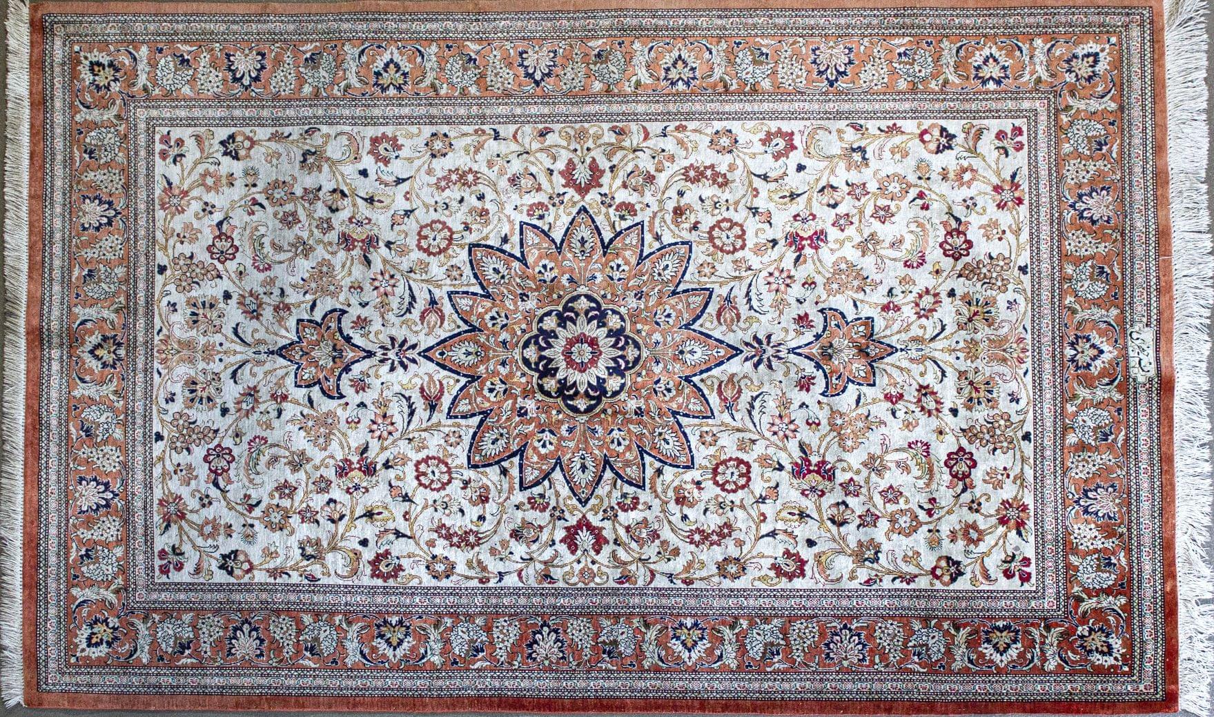 Soie, à décor d'un médaillon rayonnant rouge sur fond ivoire, 100x146 cm
