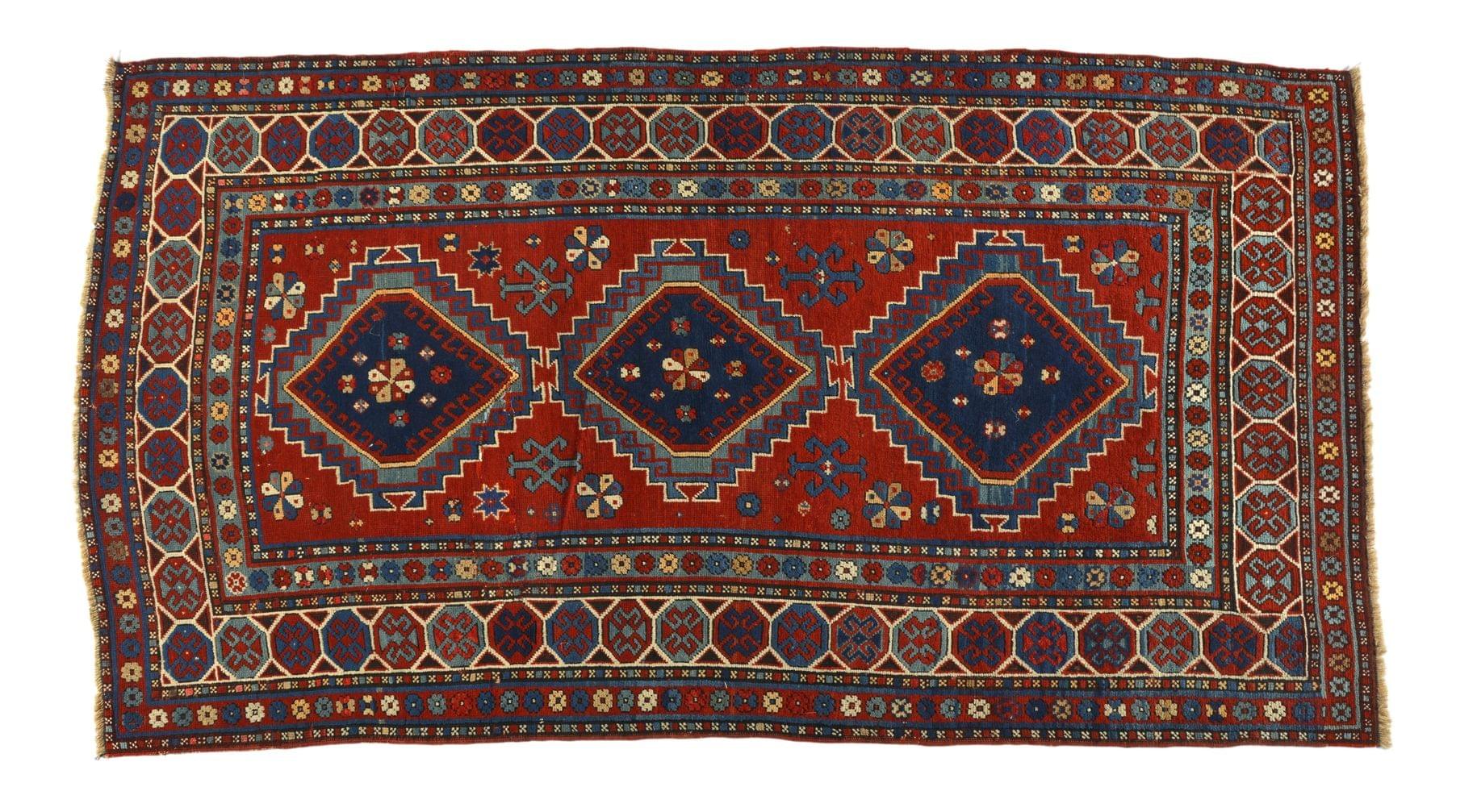 A motifs de médaillons losangiques sur fond rouge, bordure bleu...