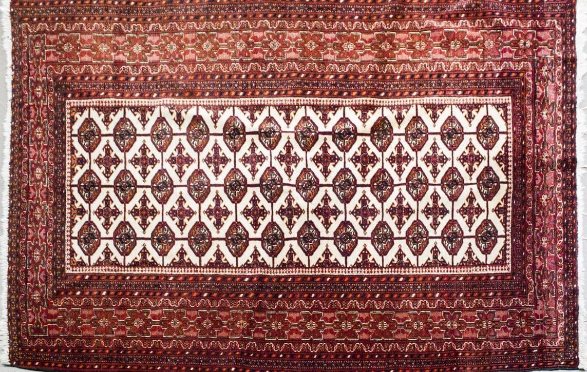 A décor de médaillons stylisés rouges sur fond beige, 170x123 cm