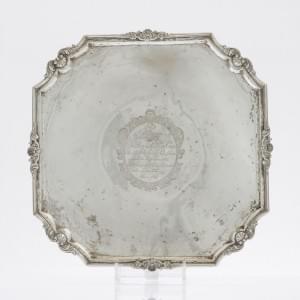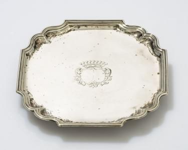 625. Petit plateau carré à angles festonnés et sur piédouche à décor...